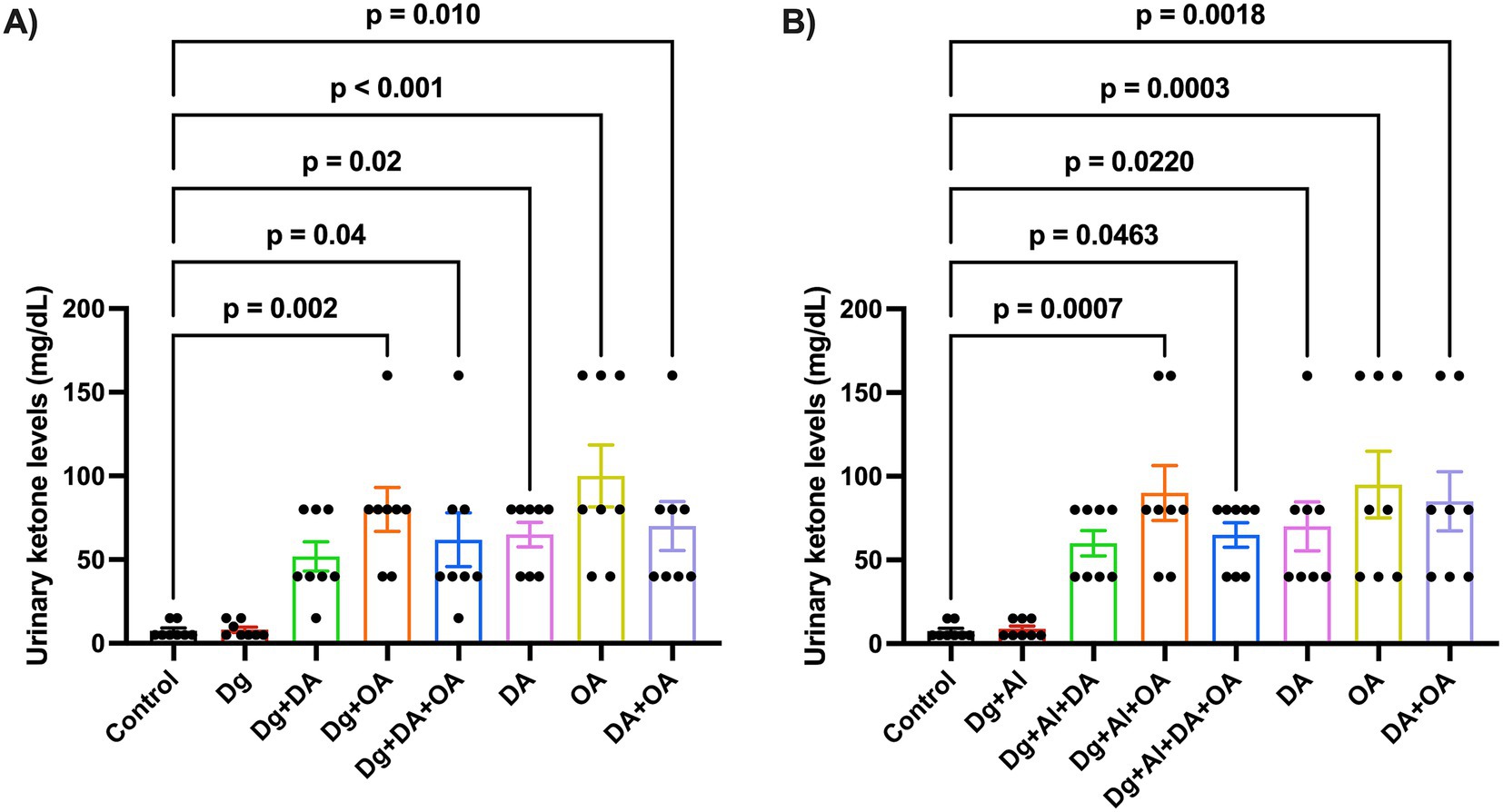 Figure 2. Urinary ketone body levels: The figure depicts the ketone body levels estimated by urinary analysis of mice in (A) D-gal induced accelerated aging model and (B) D-gal/AlCl3 induced AD-like neurotoxic model, respectively. Data is represented as Mean ± SEM (n = 8; 4 males, 4 females) and analysed by one-way ANOVA followed by Tukey’s multiple comparison test. Actual p-values for all comparisons are displayed. DA, decanoic acid; OA, octanoic acid; Dg, D-galactose, Al, aluminium chloride (AlCl3).