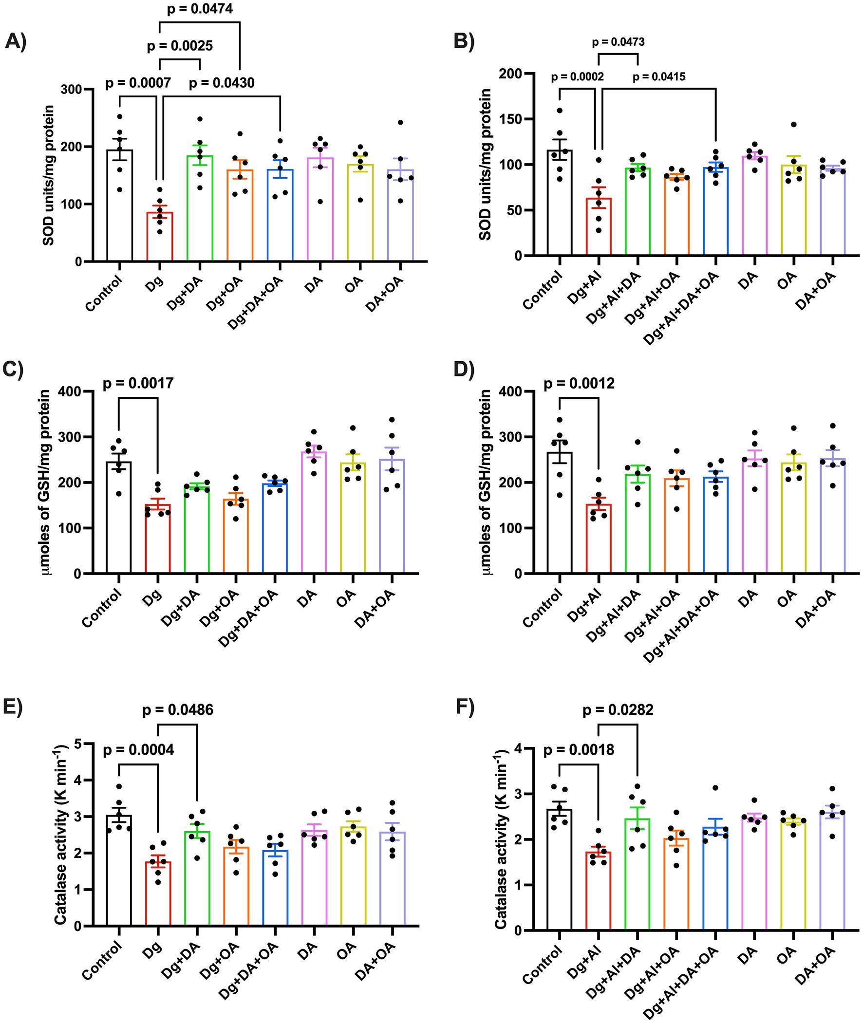 Figure 3. Evaluation of oxidative stress: The figure represents effects of MCT components on (A,B) superoxide dismutase (SOD), (C,D) reduced glutathione (GSH) and (E,F) catalase (CAT) in the D-gal induced aging model and in the D-gal/AlCl3 induced AD-like neurotoxic model, respectively. Data is represented as Mean ± SEM (n = 6; 3 males, 3 females) and analysed by one-way ANOVA followed by Tukey’s multiple comparison test. Actual p-values for all comparisons are displayed. DA, decanoic acid; OA, octanoic acid; Dg, D-galactose, Al, aluminium chloride (AlCl3).