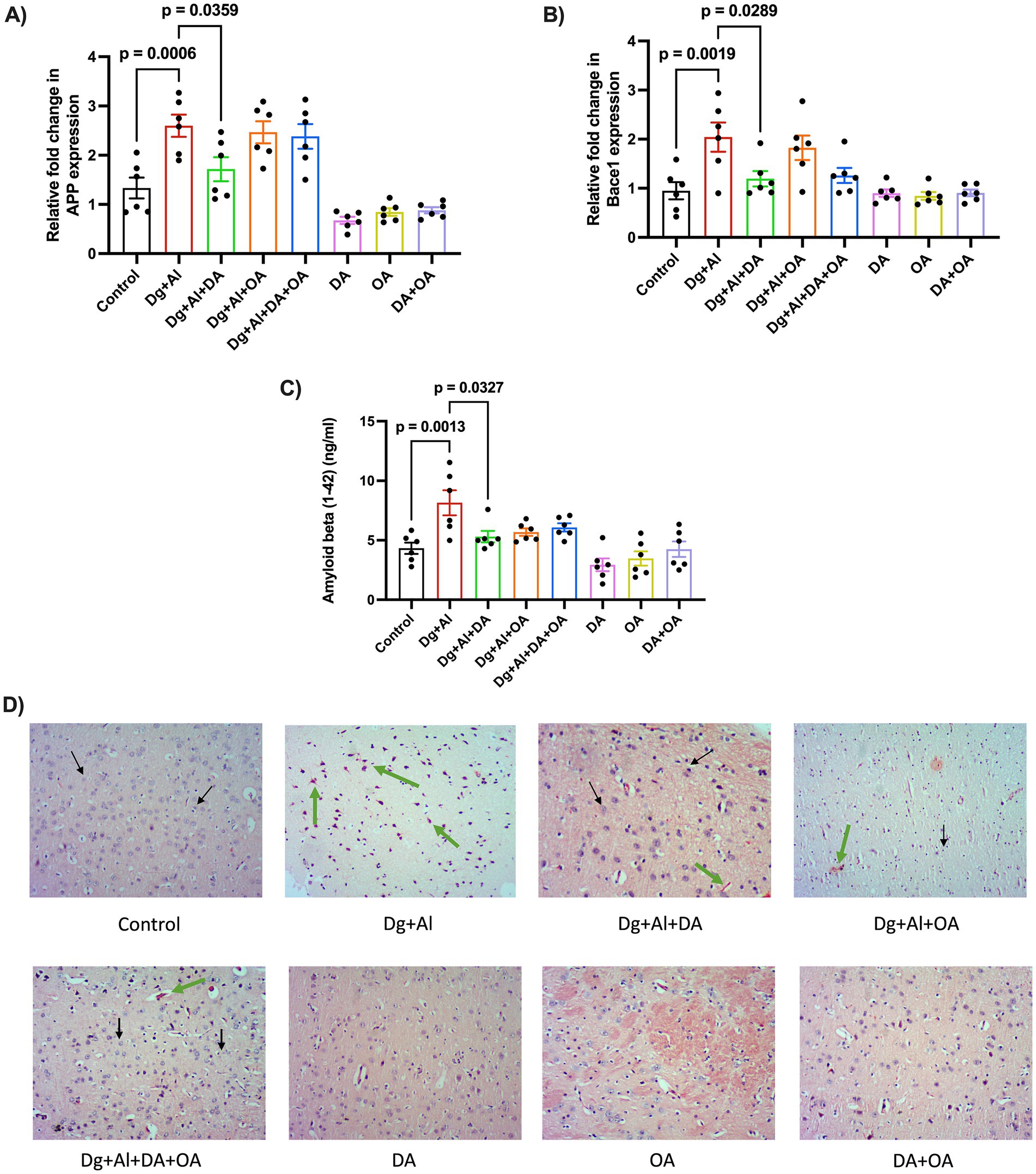 Figure 4. Quantitative and qualitative analysis of amyloid deposition in D-gal combined with AlCl3 induced AD-like neurotoxic model: The figure dictates the relative fold change in the mRNA expression of genes responsible for amyloid protein deposition, (A) APP and (B) BACE1 using RT-PCR. (C) Neuronal levels of Amyloid beta (1-42) protein estimated using ELISA. (D) Amyloids stained red after using Congo Red staining in cerebral cortex of mice with AD-like neurotoxicity induced by D-gal and AlCl3. 10X (Scale-100 μm). Black arrows = nuclei; Green arrows = amyloid deposits. Data is represented as Mean ± SEM (n = 6; 3 males, 3 females) and analysed by one-way ANOVA followed by Tukey’s multiple comparison test. Actual p-values for all comparisons are displayed. DA, decanoic acid; OA, octanoic acid; Dg, D-galactose, Al, aluminium chloride (AlCl3).