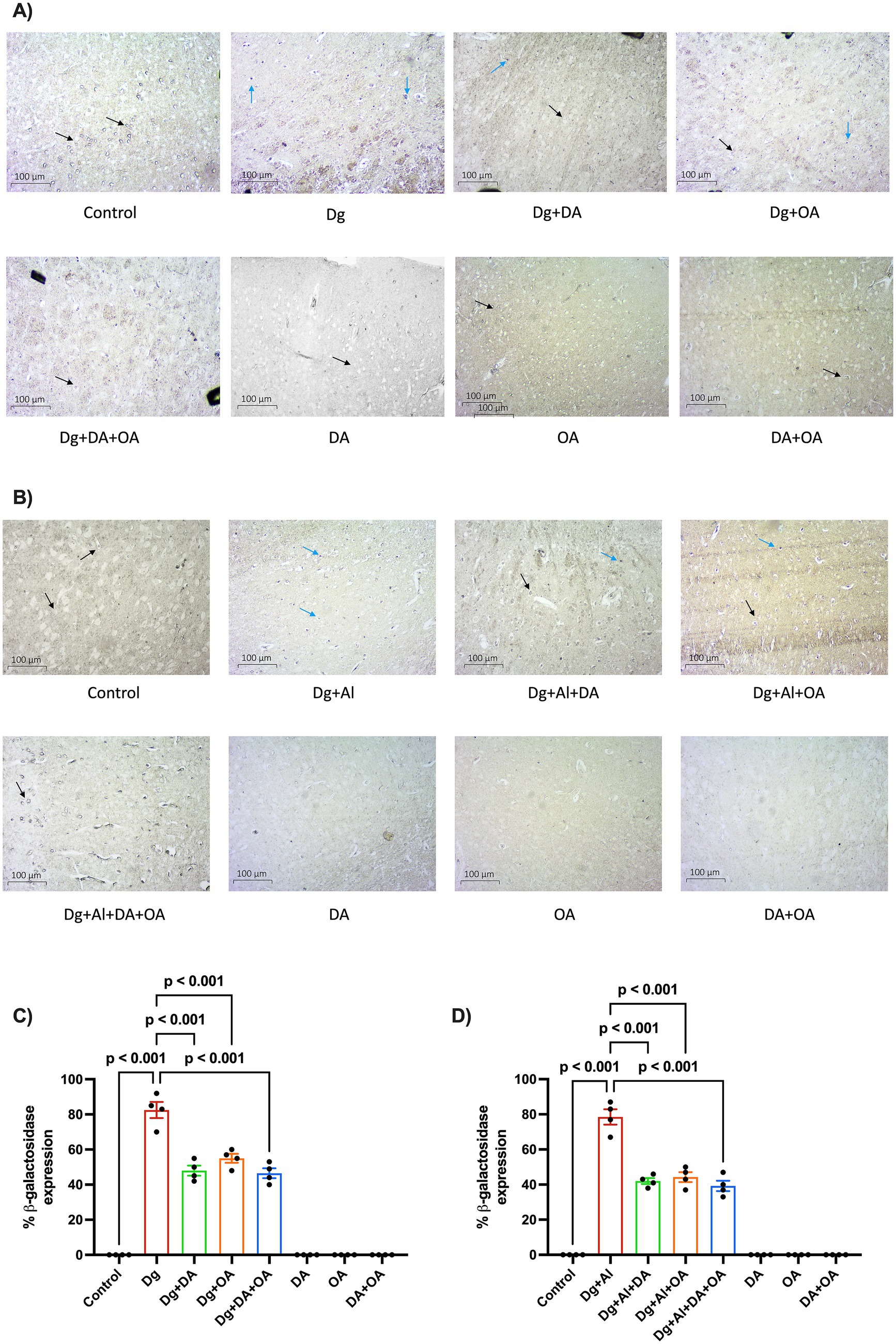 Figure 6. Senescence-associated β-galactosidase activity: The figure demonstrates the (A,B) microscopic images of the cerebral cortex and (C,D) the percentage of senescent positive cells in the D-gal induced aging model and in the D-gal/AlCl3 induced age-related AD-like neurotoxic model, respectively. 10X (Scale-100 μm). Black arrows = unstained cells, blue arrows = blue stained (senescent cells). Data is represented as Mean ± SEM (n = 2; 4 non-overlapping fields ~100 cells/field) and analysed by one-way ANOVA followed by Tukey’s multiple comparison test. Actual p-values for all comparisons are displayed. DA, decanoic acid; OA, octanoic acid; Dg, D-galactose; Al, aluminium chloride (AlCl3).