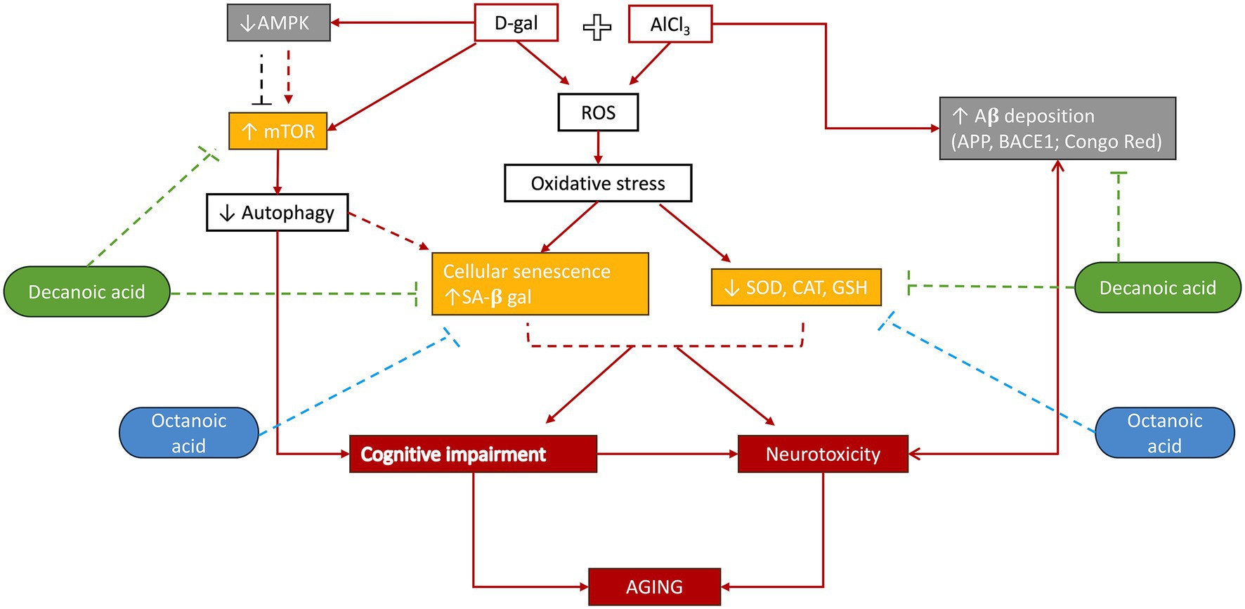 Figure 7. Schematic summary of mechanistic outcomes: D-galactose-induced toxicity increases ROS levels. The antioxidant activity of GSH, SOD, and CAT is reduced. Elevated ROS inhibits AMPK activation and boosts mTOR expression. Deregulated autophagy and oxidative stress promote cellular senescence. Decanoic acid (DA) influences mTOR activity, senescence, and antioxidant defences, while octanoic acid (OA) enhances antioxidant activity and decreases cellular senescence. D-galactose combined with aluminium chloride (AlCl3) causes AD-like amyloid toxicity, which is reduced by decanoic acid but not by octanoic acid.
