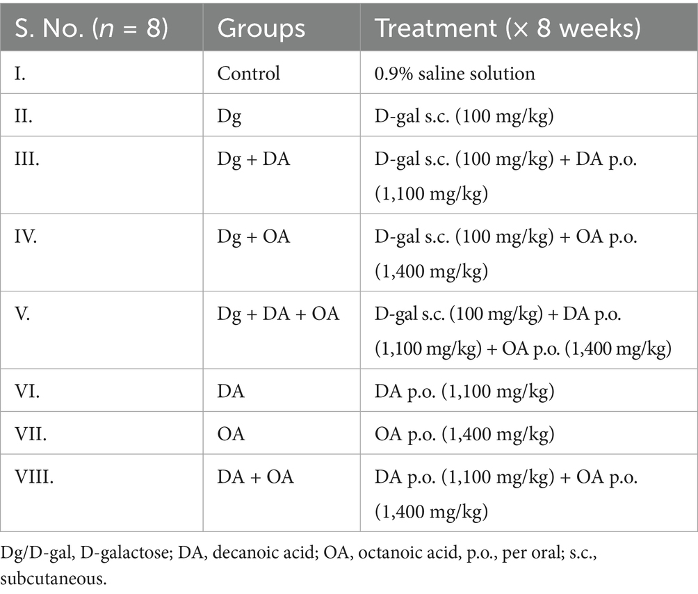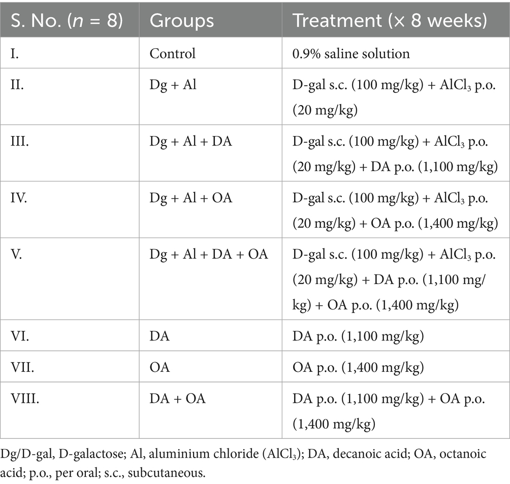 A total of 96 mice were randomly divided into eight groups, each for the D-galactose-induced accelerated aging model (Table 1), and D-galactose combined with AlCl3-induced age-related AD-like neurotoxic model (Table 2), whereby each group contained total number of 8 (n) mice (4 males, 4 females). The sample size of each group was calculated using G*Power software (version 3.1 for Mac). In the accelerated aging model, D-gal was given once daily via subcutaneous injection to Swiss albino mice for 8 weeks at a dose of 100 mg/kg (Kumar et al., 2009). To induce Alzheimer’s disease-related neurotoxicity, mice received daily oral doses of AlCl3 (20 mg/kg) and subcutaneous injections of D-gal (100 mg/kg) concurrently for 8 weeks (Xing et al., 2018). The doses of decanoic acid and octanoic acid were determined based on a clinical study involving patients with mild to moderate Alzheimer’s disease, which evaluated the effects of a ketogenic formula made from medium-chain triglycerides (MCTs) on cognitive functions (Ota et al., 2016). To estimate the corresponding doses for animals, the human doses were converted to animal equivalent dose using the Km ratio (Nair and Jacob, 2016). The calculated doses for mice were 1,100 mg/kg for decanoic acid and 1,400 mg/kg for octanoic acid. In the experiment, both compounds were administered together at their full individual doses, totalling 2,500 mg/kg. Each MCT component and its combinations were given once daily through oral gavage in a volume not exceeding 10 mL/kg of body weight, simultaneously with D-gal and D-gal/ AlCl3. They were administered as a suspension in a 0.5% aqueous methyl cellulose solution, which functions as a suspending agent to ensure consistent dosing and has no physiological or behavioural effects since it is not absorbed systemically.