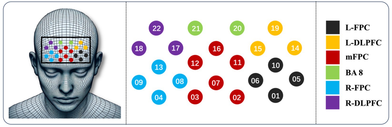 The experiment used a customized optode cap to measure participants’ prefrontal cortex regions. The probe holder was equipped with 8 emission optodes and 7 detection optodes (3 cm spacing), forming 15 probes and 22 channels (CH). Channel distribution strategically covered important cortical areas: CH01, CH05, CH06, CH10: left frontal polar cortex (L-FPC); CH04, CH08, CH09, CH13: right frontal polar cortex (R-FPC); CH02, CH03, CH07, CH11, CH12, CH16: medial frontal polar cortex (mFPC); CH14, CH15, CH19: left dorsolateral prefrontal cortex (L-DLPFC); CH17, CH18, CH22: right dorsolateral prefrontal cortex (R-DLPFC); CH20, CH21: Brodmann area 8 (BA8), as shown in Figure 2. These regions play crucial roles in cognitive function, decision-making, social cognition, complex problem-solving, and information integration across different brain areas (Ehlis et al., 2014). The sampling frequency was set to 100 Hz to ensure sufficient temporal resolution for capturing hemodynamic changes.