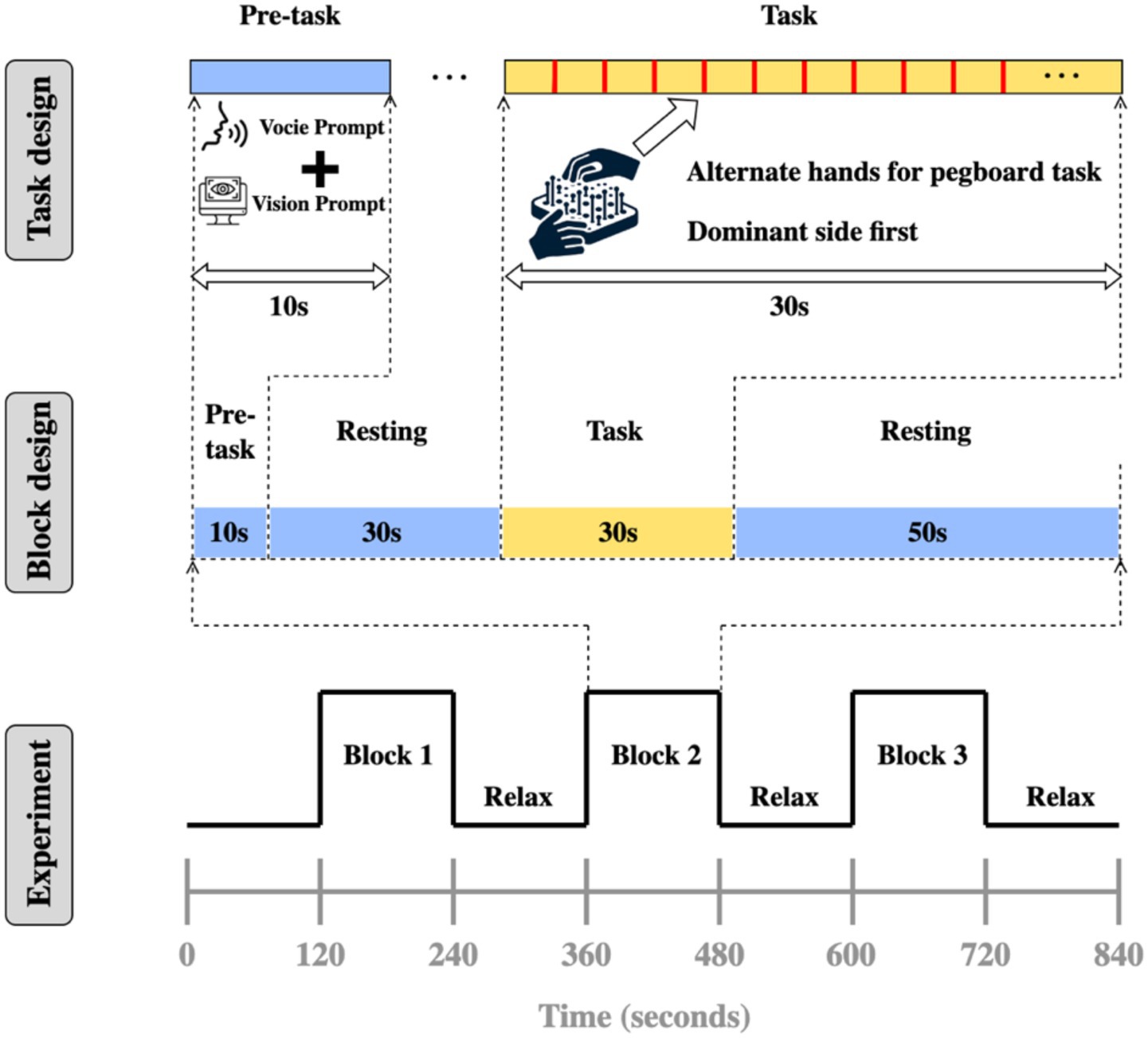 The experiment employed a block design paradigm, with each test cycle including: pre-task phase (blank screen 10 s), rest phase (blank screen 30 s), task phase (task execution 30 s), rest phase (blank screen 50 s). The total experimental duration was 840 s (14 min), including multiple task-rest cycles, as illustrated in Figure 3. The 30-s task duration was selected based on established fNIRS hemodynamic response characteristics, where the main peak of hemodynamic response function (HRF) occurs around 5–6 s with a duration of approximately 8 s, followed by an undershoot peaking around 15 s (Machado et al., 2021). This duration aligns with successful fNIRS motor paradigms that have employed 20–30 s task blocks (Carius et al., 2016).