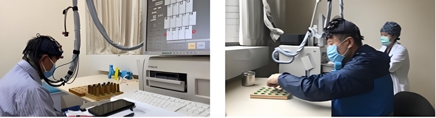 Data collection was conducted in a quiet, light-controlled environment. Participants were asked to relax for 5 min before the experiment to minimize hemodynamic responses induced by previous activities. During the experiment, all potential environmental disturbances were eliminated, participants were instructed to remain relaxed, avoid unnecessary movements or thinking, and sit comfortably in chairs. During the task phase, subjects were required to continuously complete pegboard tasks using both hands. This task required subjects to insert pegs into holes in the pegboard as quickly and accurately as possible, challenging their hand dexterity and coordination, as shown in Figure 4. According to recent research from institutions including the University of Florida and Northwestern University, pegboard tasks can provide objective, reliable data for tracking motor symptom progression in PD and atypical parkinsonism (Buard et al., 2022; Proud et al., 2020; Bezdicek et al., 2014). This is a practical, cost-effective measurement method that complements subjective clinical scales and expensive imaging techniques, providing a direct approach for efficacy assessment in clinical trials and research.
