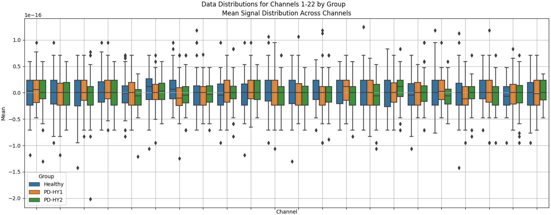The preprocessed dataset showed relatively balanced distribution characteristics across groups, as shown in Figure 7. Average signal intensities from channels CH01 to CH22 displayed intergroup differences, with data generally trending toward normal distribution without significant bias or extreme imbalance phenomena.