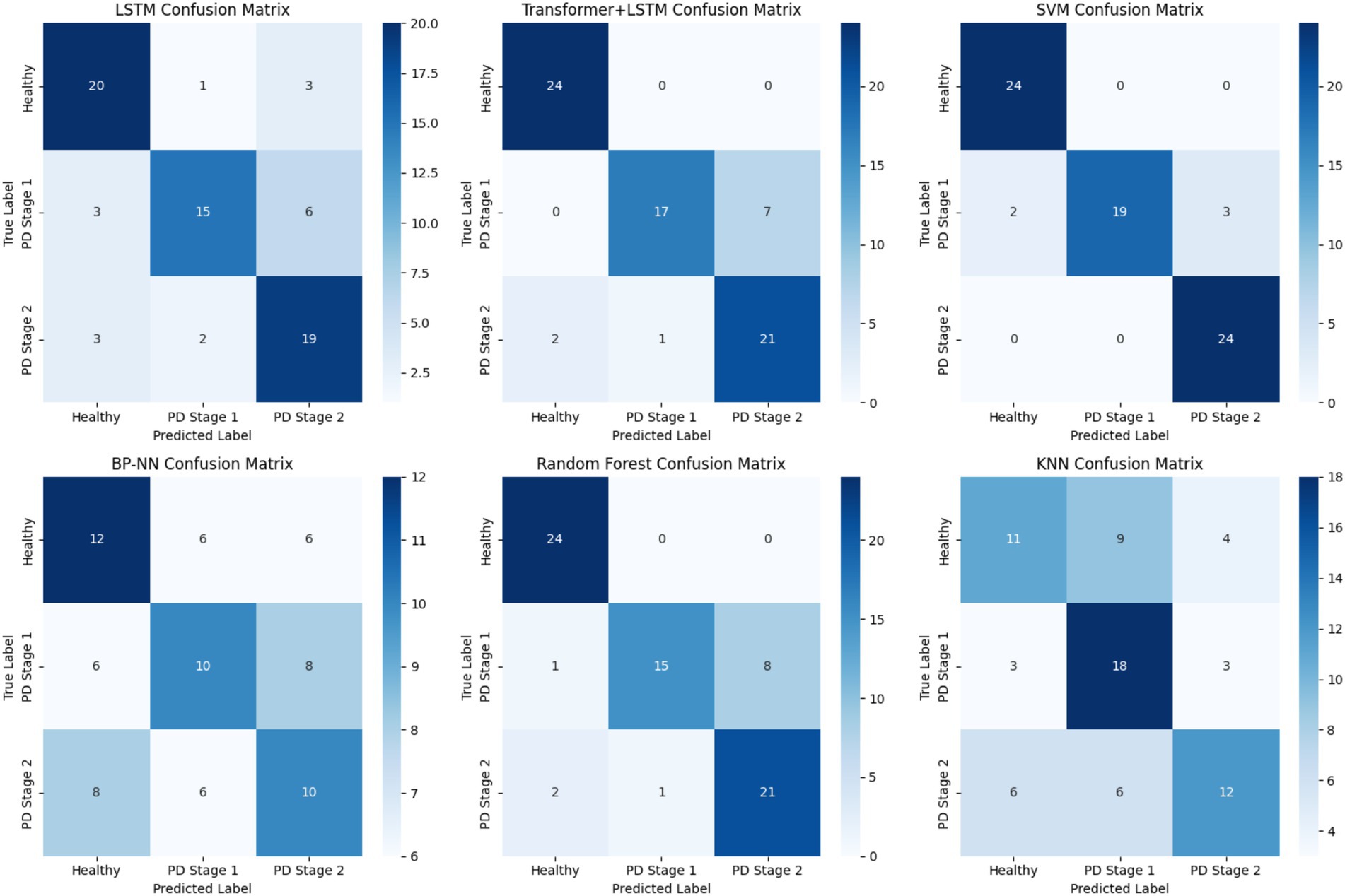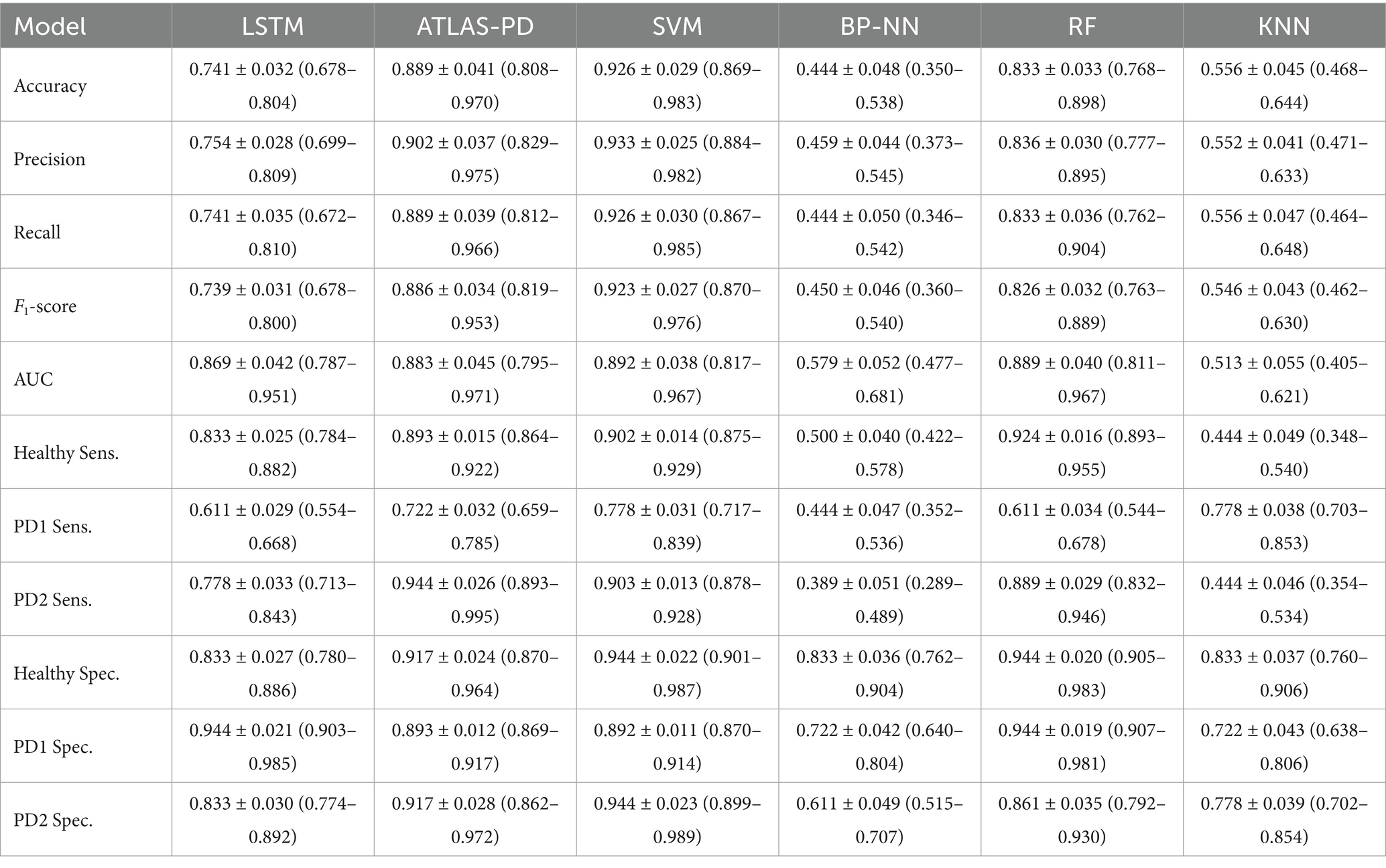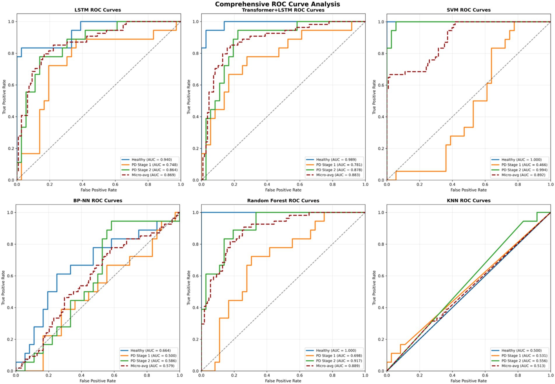 Performance evaluation results of six classification models are summarized in Table 3. While SVM achieved the highest overall accuracy (92.6%), deeper analysis revealed critical limitations in its clinical applicability. Most notably, SVM’s ability to detect PD H&Y stage 1 patients was severely compromised, with an AUC of only 0.466—worse than random chance—despite its high overall accuracy. In contrast, the ATLAS-PD (Transformer + LSTM) hybrid model achieved more balanced performance with an accuracy of 88.9% and F1-score of 0.886. Crucially, ATLAS-PD demonstrated consistent discrimination ability across all groups, with AUC values of 0.99, 0.78, and 0.88 for healthy controls, PD H&Y stage 1, and PD H&Y stage 2 groups, respectively.