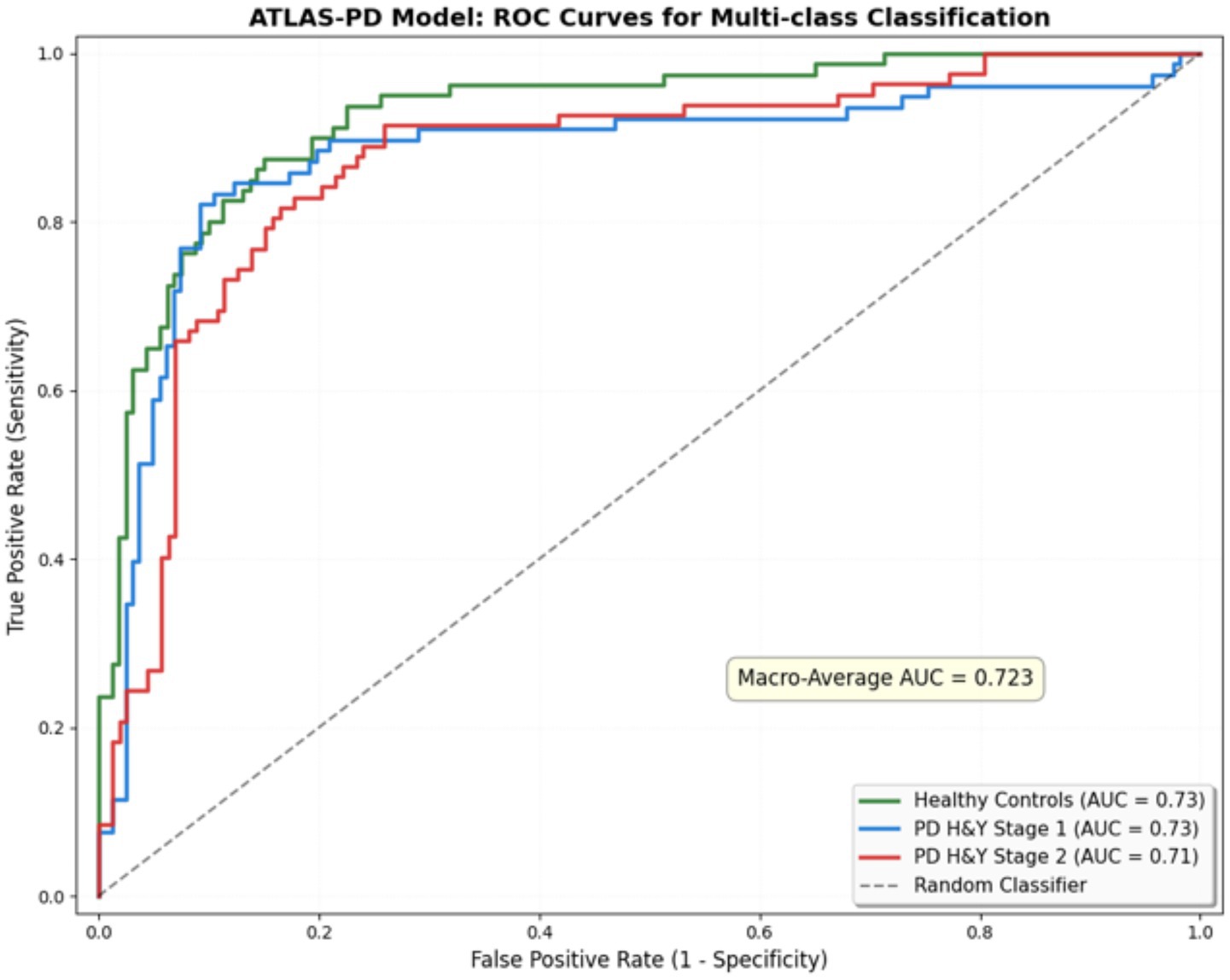Conclusion: ATLAS-PD provides an objective, non-invasive tool for early PD diagnosis and staging in H&Y stages 1–2. The inclusion of complementary tasks and statistical validations enhances its clinical applicability. Future studies should validate the model’s performance in more advanced PD stages to enhance clinical applicability.