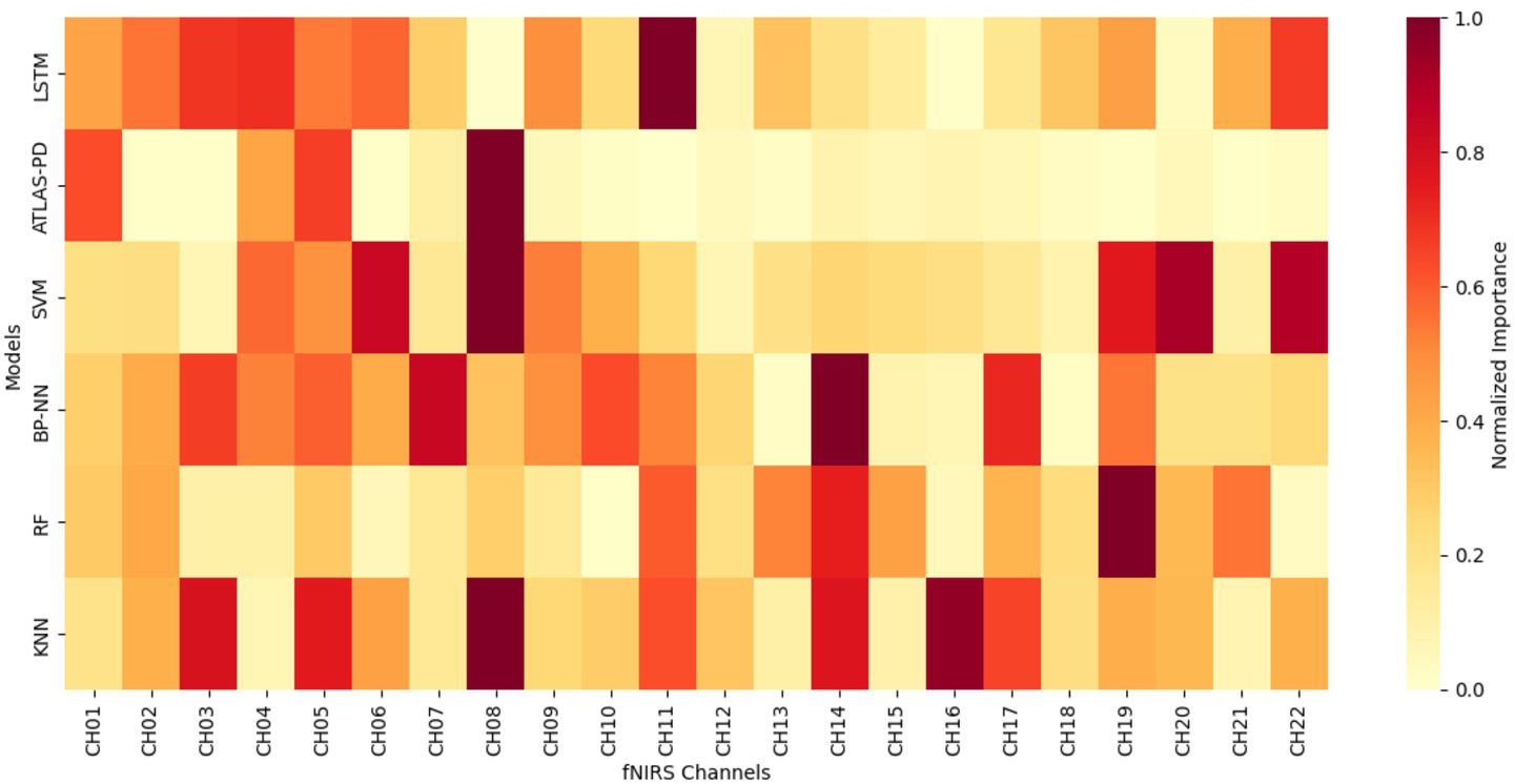 Regarding machine learning method applications, many early studies primarily relied on traditional machine learning algorithms. For instance, research has used SVM to classify fNIRS data to distinguish PD patients from healthy controls (Abtahi et al., 2020). Our study results contrast with these findings and further expand research boundaries. Although SVM also demonstrated certain classification ability in our study, its performance was significantly lower than deep learning models, especially when handling complex multi-class tasks. This may be attributed to limitations in feature engineering for traditional machine learning models, which often require manual feature extraction, while deep learning models can automatically learn and extract more discriminative deep features from raw data (Ahalya et al., 2024).