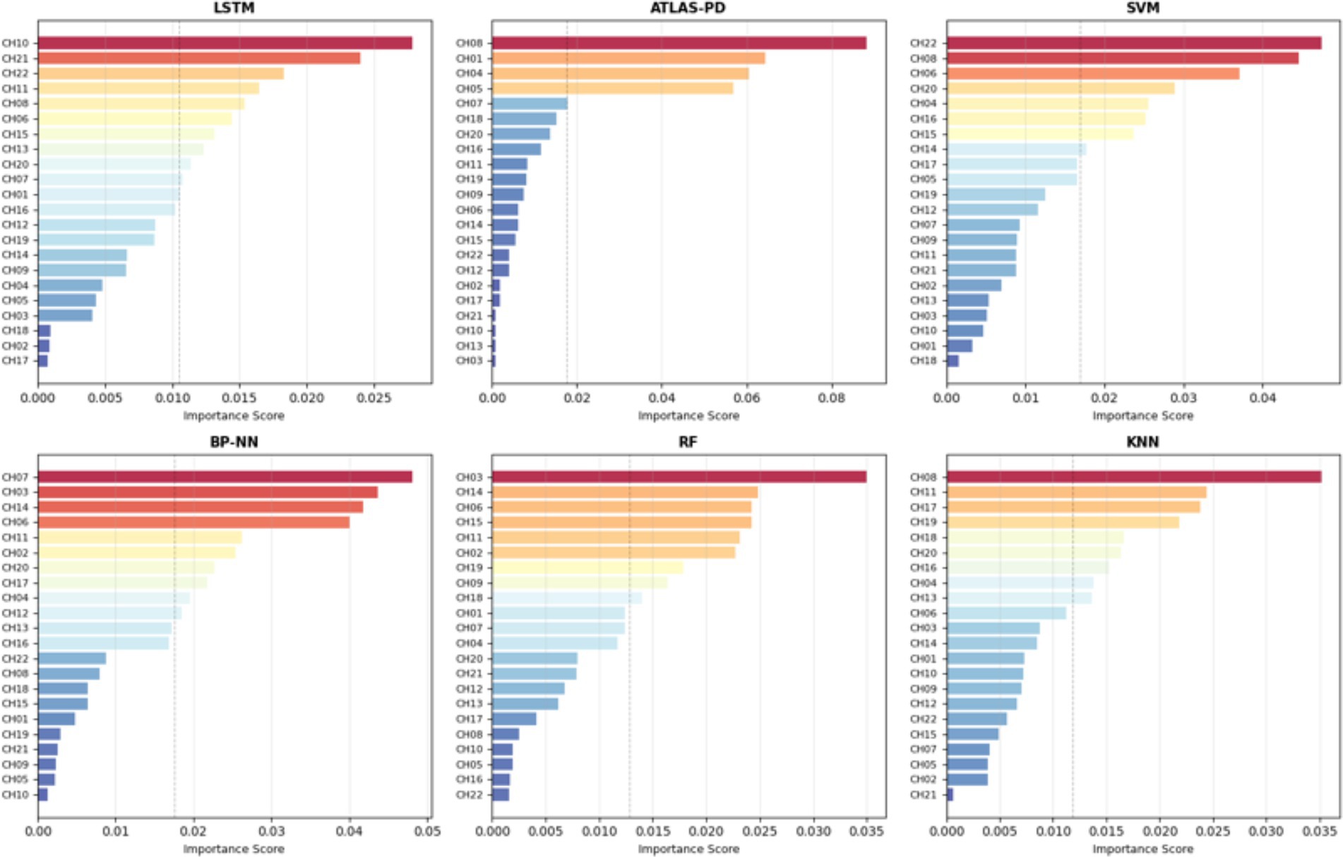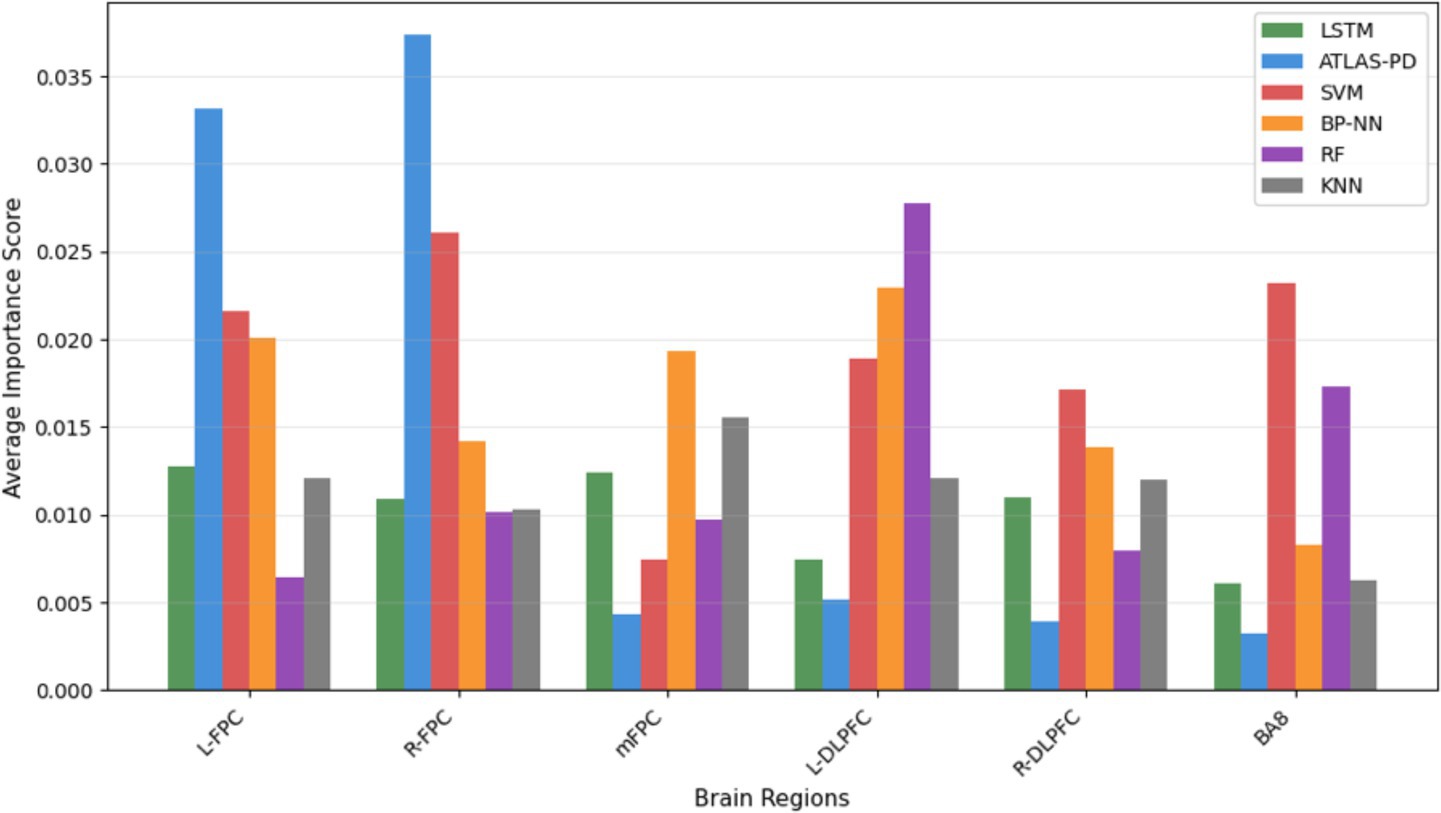 To address the black-box nature of deep learning models and provide clinically interpretable insights, this study employed permutation importance methods to quantify the contribution of each fNIRS channel to model classification performance. Importance scores were normalized to the [0, 1] interval, with higher values indicating greater channel contribution to model decisions. The importance scores of 22 channels were aggregated according to their anatomical regions, calculated as the average importance score of constituent channels. Additionally, all channels for each model were ranked in descending order by importance scores to identify the key channels most relied upon by each model. Additionally, t-SNE was applied to reduce the dimensionality of features extracted from the ATLAS-PD model’s penultimate layer (van der Maaten and Hinton, 2008). The analysis utilized perplexity values of 30 and 50, to generate 2D and 3D projections, density contours, and comparative visualizations.