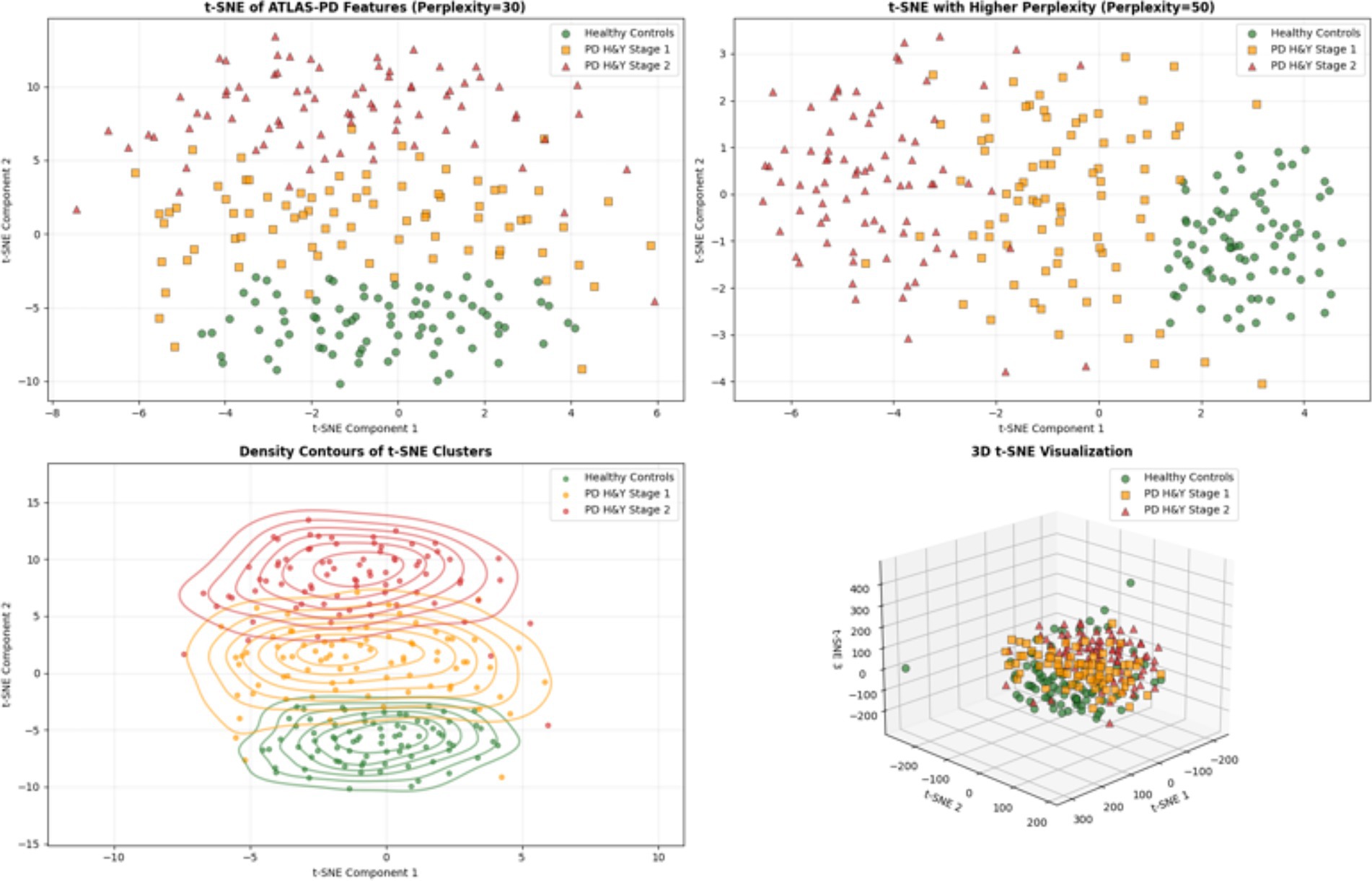 Figures 11, 12 presents channel importance scores across all models, revealing consistent patterns in feature utilization. Notably, channels CH01, CH04, CH05, and CH08 demonstrated the highest importance scores (>0.05) in the ATLAS-PD model, with CH08 exhibiting exceptional discriminative power (importance score: 0.095). Brain region analysis (Figure 13) aggregates channel importance by anatomical regions, demonstrating that bilateral frontal polar cortex (L-FPC and R-FPC) regions contributed most significantly to classification performance across all models. The ATLAS-PD model showed particularly strong reliance on R-FPC (average importance: 0.037) compared to other regions. The top-ranked channels in the ATLAS-PD model (CH08, CH01, CH04, CH05) all correspond to frontal polar regions, suggesting the model learned to focus on neurophysiologically relevant areas without explicit spatial constraints. t-SNE visualizations (Figure 14) of the ATLAS-PD feature space demonstrated distinct clustering, with healthy controls forming a compact group separate from PD patients. Partial overlap was observed between H&Y stage 1 and stage 2, reflecting the disease continuum. The 2D projections (perplexity = 30 and 50), 3D visualization, and density contours further highlighted these patterns, aligning with the model’s focus on bilateral frontal polar cortex signals.
