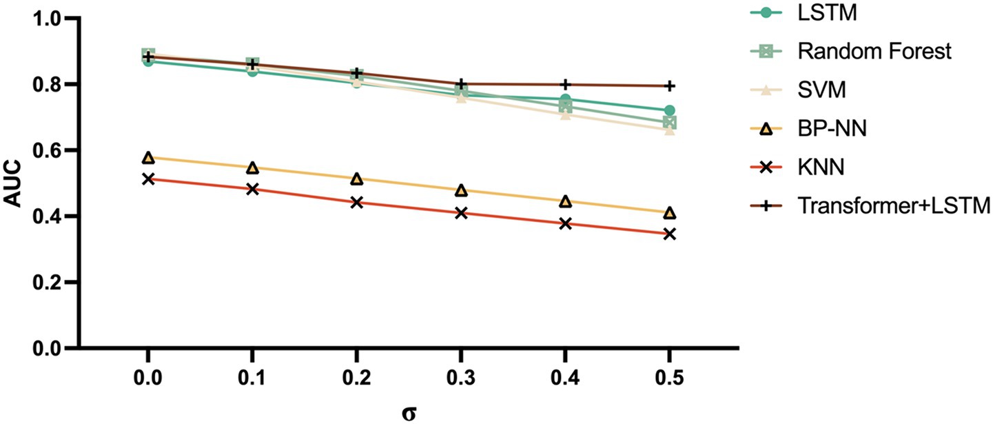 Noise injection experiment results showed that the Transformer + LSTM model demonstrated the best noise robustness, maintaining 80.09% accuracy under 0.3 noise level, as shown in Figure 15.