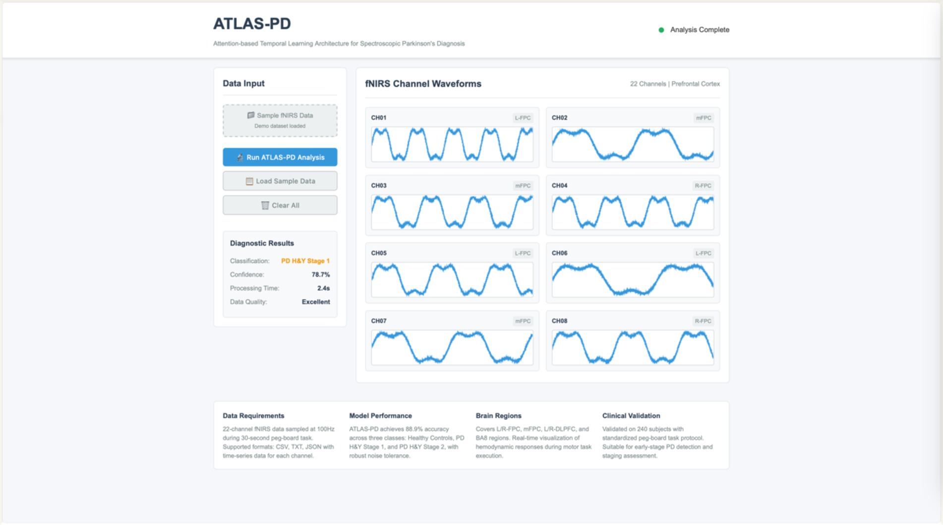 To validate the feasibility and effectiveness of the ATLAS-PD model in actual clinical environments, a preliminary web-based diagnostic assistance platform was developed and tested within the secure internal network of Beijing Rehabilitation Hospital. This prototype system represents an initial proof-of-concept implementation rather than a clinically-ready solution. The platform utilized Python Flask framework for backend processing and HTML5/CSS3 for user interface, enabling local processing of fNIRS data within the hospital’s secure network environment. The system employs a ATLAS-PD hybrid deep learning architecture as the core algorithmic engine, implementing GUI design and achieving fully automated processing from fNIRS data acquisition to diagnostic result output. The system architecture adopts a front-end and back-end separated design pattern, with the front-end based on responsive web technology to build user interaction interfaces, supporting real-time input, validation, and visualization of 22-channel fNIRS data. The back-end integrates the pre-trained ATLAS-PD model, implementing data transmission and model inference through API interfaces. Clinical physicians can obtain three-class diagnostic results and corresponding confidence assessments through the system, providing objective decision support tools for traditional clinical assessments, as shown in Figure 16.
