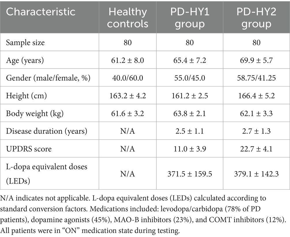 This study employed a cross-sectional design, including three different subject groups: PD H&Y stage 1 patient group, PD H&Y stage 2 patient group, and healthy control group. Each group included 80 subjects, totaling 240 participants. Detailed demographic and clinical characteristics of the subjects are shown in Table 1. Sample size calculation was conducted using G*Power 3.1.4 software based on a priori power analysis. Based on previous fNIRS-PD studies reporting medium effect sizes (Cohen’s d ≈ 0.3–0.5) (Bonilauri et al., 2022; Nieuwhof et al., 2016; Wang et al., 2024), we assumed a medium effect size (Cohen’s f = 0.30) for one-way ANOVA comparing three groups. With a statistical power of 0.80, α = 0.05, and three-group design, the minimum required sample size was calculated as 111 participants total. We selected 80 participants per group (240 total) to provide additional margin and account for potential dropouts. For deep learning model training, our sample size (n = 240) exceeds the minimum requirements suggested in similar neuroimaging studies (n > 200), ensuring adequate data for model training and validation without overfitting (Li X. et al., 2023; Eken et al., 2024; Lei et al., 2024).