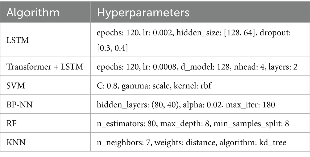 To comprehensively evaluate deep learning model performance, this study selected four representative traditional machine learning algorithms for comparative analysis. SVM was chosen for its excellent performance in high-dimensional spaces and its ability to handle nonlinear problems, particularly suitable for processing multi-channel fNIRS data. BP Neural Network (MLP), as a classic feedforward neural network, can learn nonlinear mapping relationships in data, providing a benchmark comparison for deep learning methods. RF reduces overfitting risk through ensemble learning strategies, providing robust classification performance, while its feature importance assessment function helps identify key fNIRS channels. KNN algorithm, based on instance-based learning methods, is simple and intuitive, reflecting local structural characteristics of data. These four algorithms cover different machine learning paradigms, providing a comprehensive comparison benchmark for evaluating deep learning model advantages. Specific hyperparameter configurations for each model are detailed in Table 2 (see Figure 6).