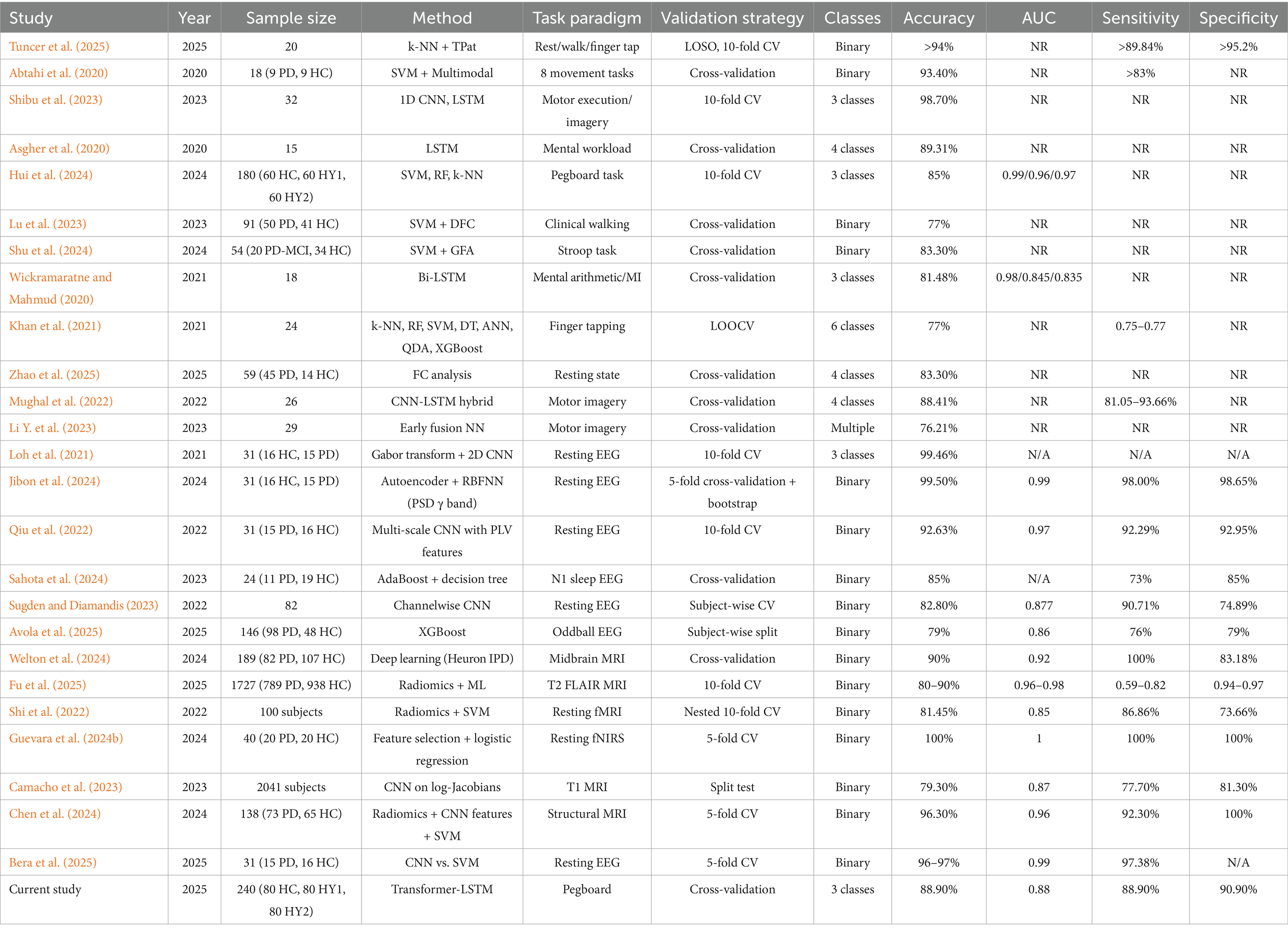 Our results exhibit competitive or superior performance when benchmarked against recent fNIRS-based PD classification studies, as summarized in Table 4. Most existing studies achieved accuracies ranging from 76–94%, with sample sizes typically below 100 participants. Notable methodological trends include: (1) CNN-LSTM hybrid architectures achieving 81–89% accuracy in motor and speech-based tasks; (2) traditional machine learning approaches (SVM, RF) reaching 77–93% accuracy but often limited by small sample sizes and lack of robustness testing; (3) multimodal approaches combining fNIRS with EEG achieving higher accuracy (91–94%) but at the cost of increased complexity and reduced clinical practicality.