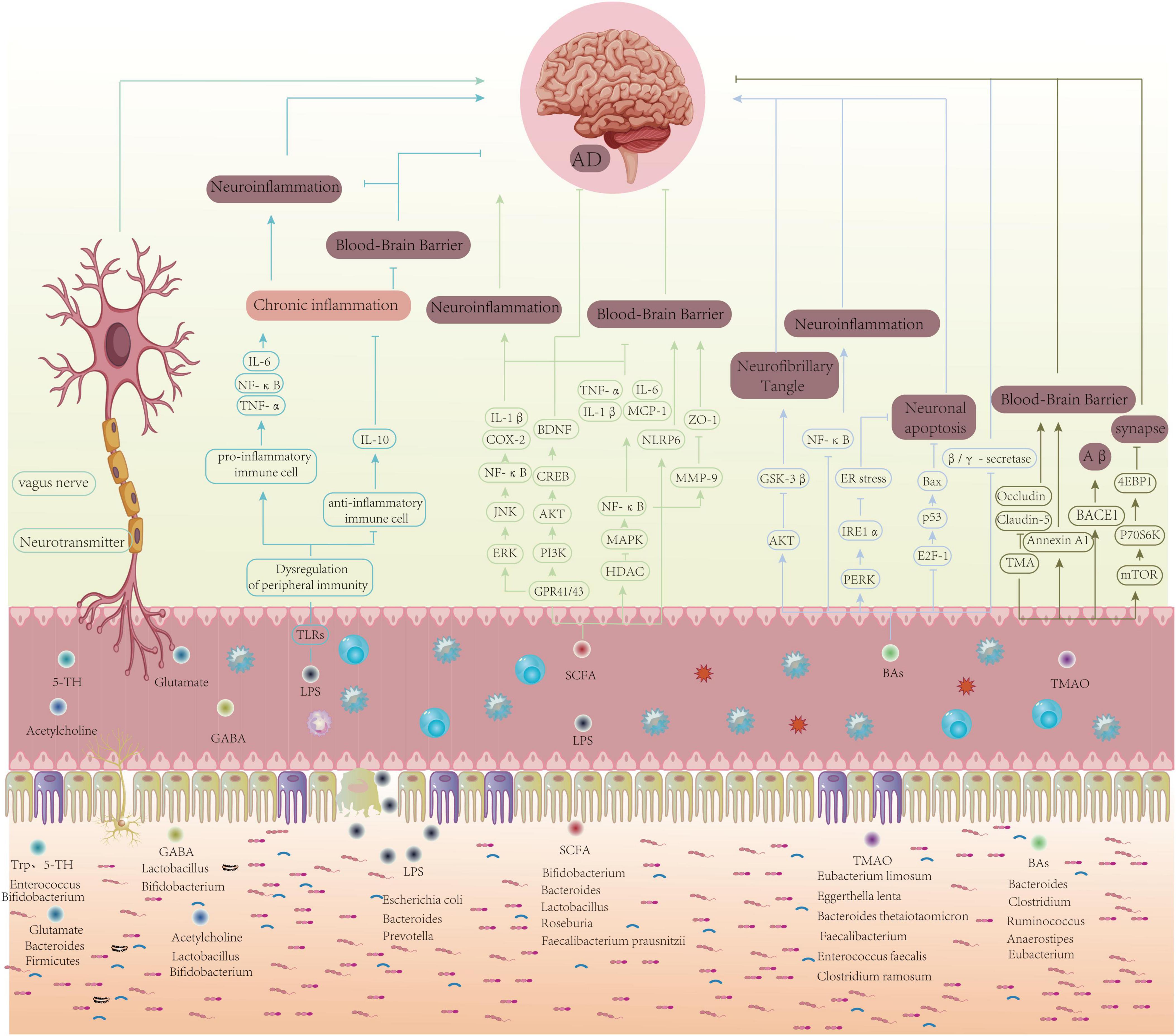 Alzheimer’s disease (AD) is a multifactorial neurodegenerative disorder characterized by cognitive decline, including memory impairment and behavioral abnormalities. The onset of AD is driven by complex interactions among genetic, molecular, and environmental factors (Lane et al., 2017). According to the World Health Organization, AD is rapidly becoming a global public health challenge, with projections indicating that by 2050, more than 131 million people will be affected worldwide (Scheltens et al., 2021). Key pathological features of AD include amyloid-β (Aβ) accumulation, tau hyperphosphorylation, neuronal and synaptic dysfunction, and neuroinflammation, all of which contribute to disease progression (Rostagno, 2022). Early research primarily focused on the gut microbiota as a potential biomarker for diagnosing AD. However, more recent studies have elucidated a bidirectional regulatory relationship between the gut microbiota and the brain via the gut-brain axis (Rutsch et al., 2020). Dysbiosis of the gut microbiota has been implicated in neuronal damage, triggering immune system dysfunction and neuroinflammation, which compromise the blood-brain barrier and heighten the risk of AD development (Wu et al., 2021).