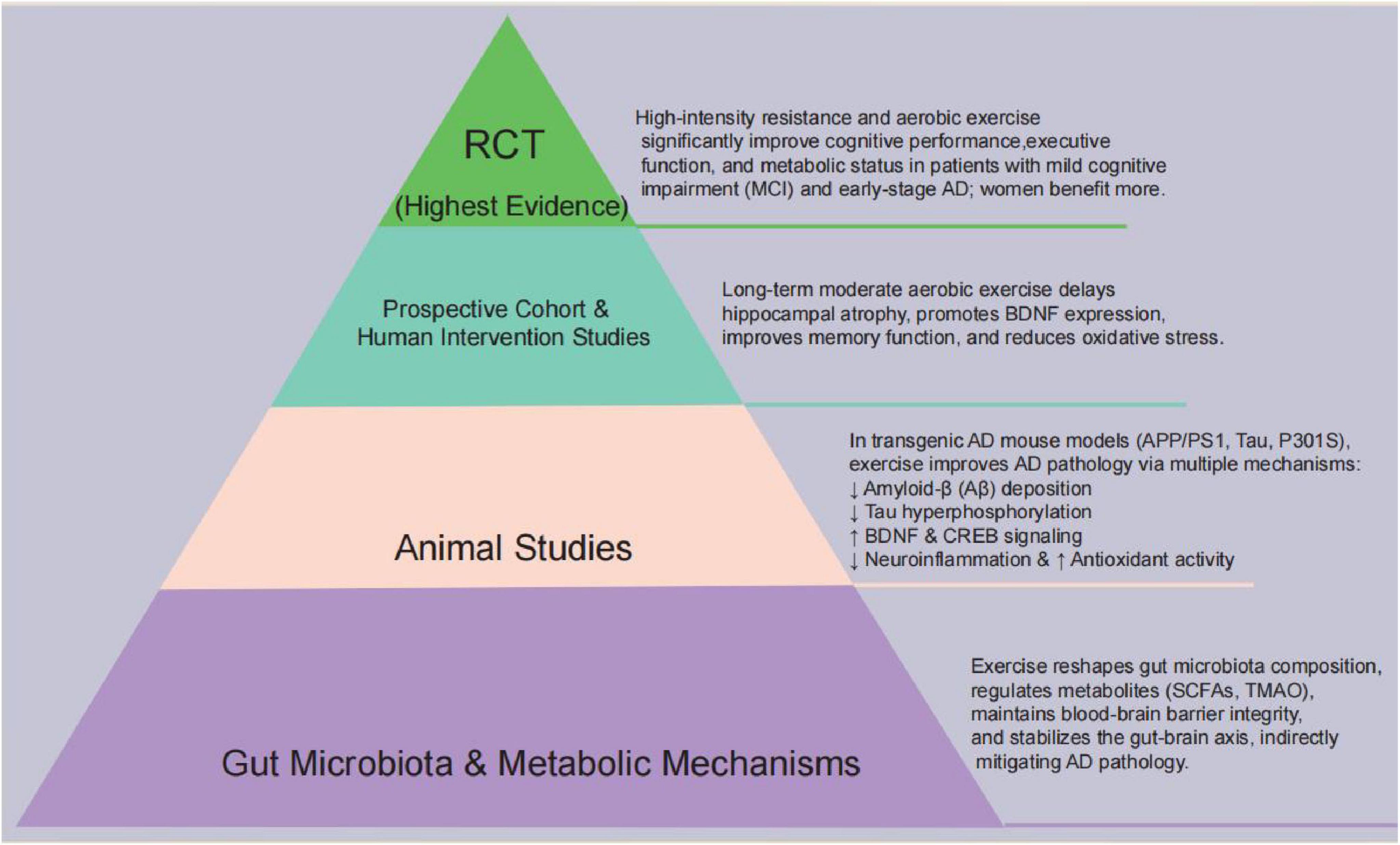 Figure 3. Evidence pyramid linking exercise, the gut–brain axis and AD: gut-microbiota and metabolic mechanisms at the base, followed by animal studies, prospective/human interventions, and RCTs; overall, aerobic and resistance exercise are associated with improved cognition and reduced AD pathology.