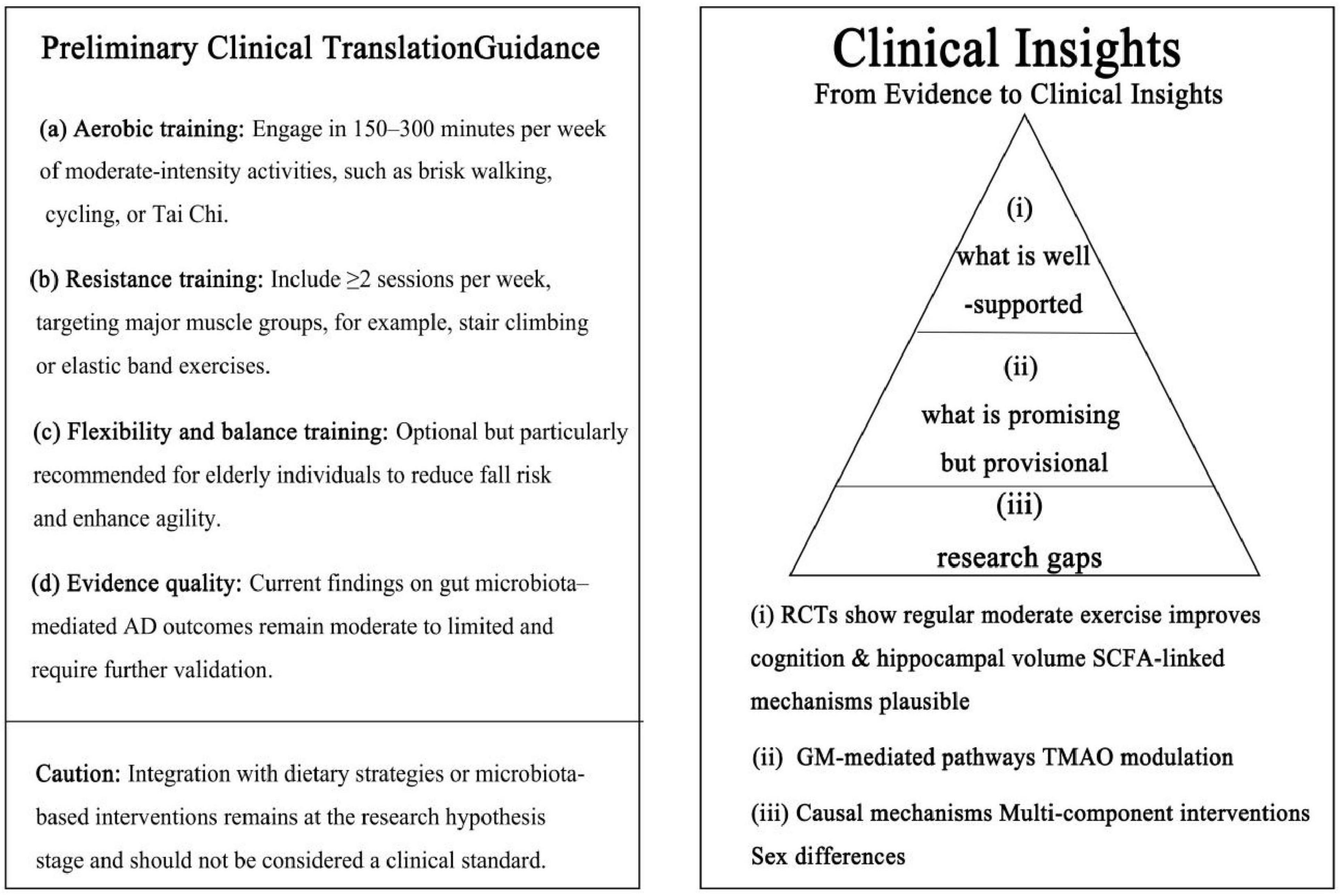 Figure 4. Clinical key insights and evidence hierarchy. Left: preliminary exercise guidance derived from reproducible human studies (aerobic, resistance, flexibility/balance; evidence quality and caution). Right: Evidence pyramid: (i) well supported—moderate-intensity exercise improves cognition and hippocampal volume; SCFA-linked mechanisms plausible; (ii) promising but provisional—gut microbiota-mediated pathways and TMAO modulation; (iii) research gaps—causal mechanisms, multi-component interventions, and sex differences. The figure aligns with the manuscript’s evidence tiers and avoids over-extrapolation.