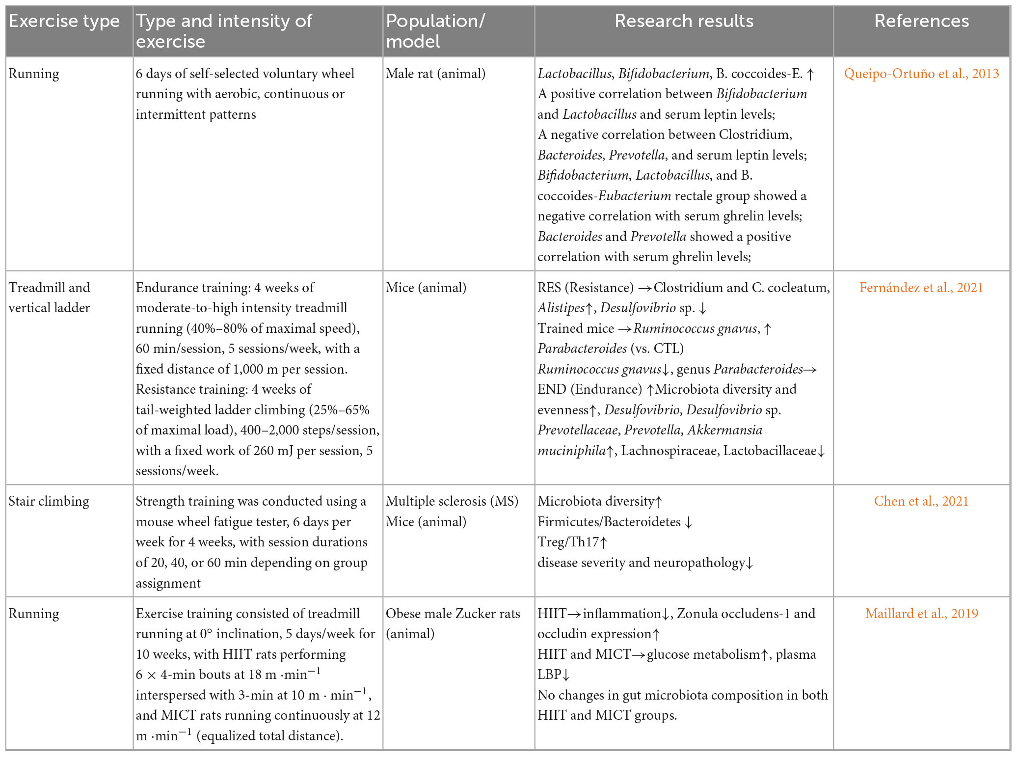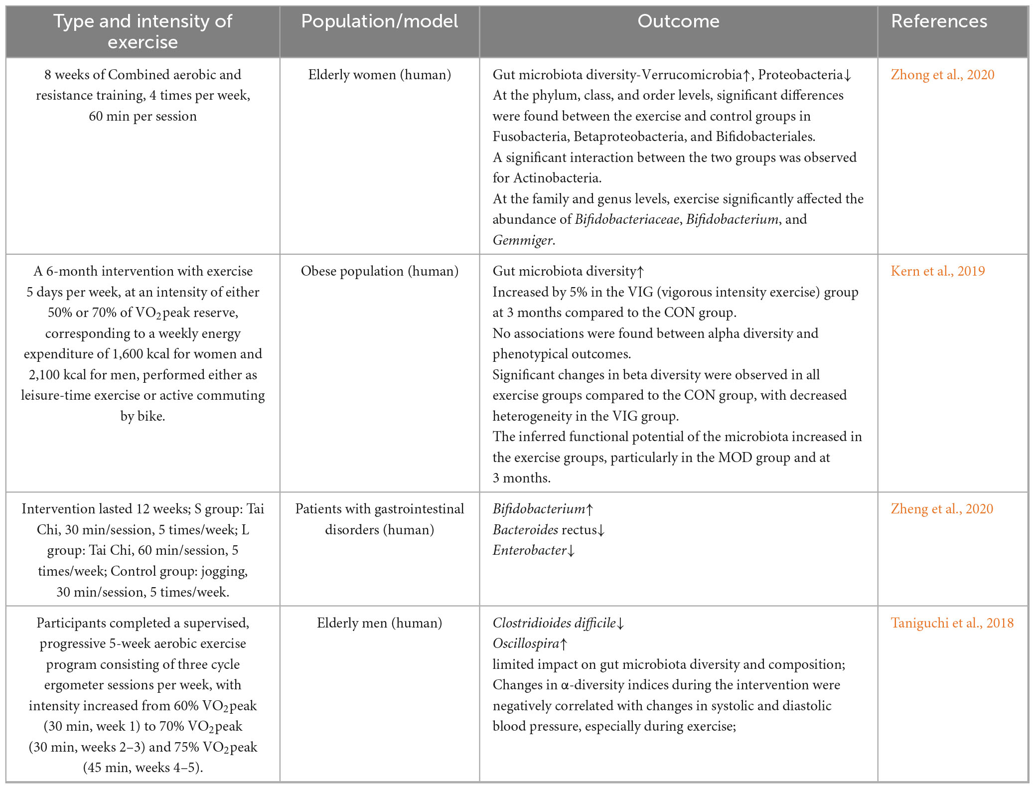 In contrast, Maillard et al. (2019) found that high-intensity anaerobic exercise could suppress inflammatory responses and regulate metabolic disorders of glucose and lipids, but these changes were not related to alterations in the composition of the gut microbiota. The above studies suggest that exercise can influence the diversity of the gut microbiota, significantly regulate its composition, and suppress the body’s inflammatory responses. However, there is heterogeneity in the impact of exercise on the gut microbiota, with most studies confirming that exercise increases gut microbiota diversity and abundance, preventing intestinal damage. On the other hand, some studies have found that the beneficial effects of exercise on the body are not related to changes in the overall composition and structure of the gut microbiota. The differences in the results of studies on exercise and gut microbiota may be related to factors such as the study subjects, methods, exercise intensity, exercise load, and exercise modalities, and further in-depth research is needed. However, existing literature lacks specific descriptions of exercise form, intensity, duration, and volume, making it difficult to summarize the effects of more complex exercise forms/strengths and durations on the gut microbiota. Additionally, no studies have explored the impact of exercise interventions on the gut microbiota from the perspective of individual differences in the participants (Tables 1a, b).