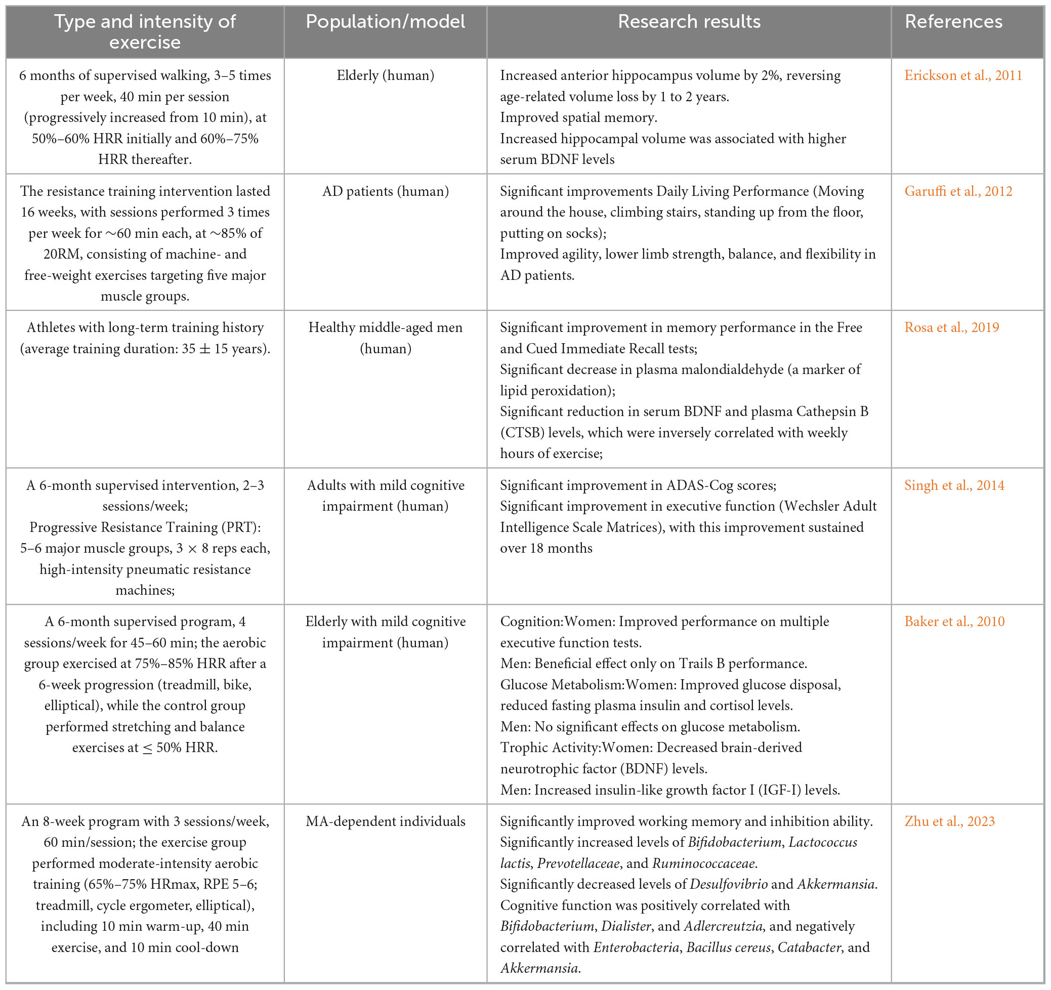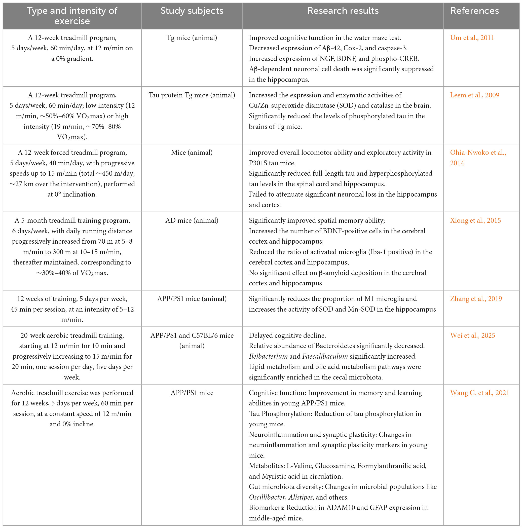 AD, as a highly complex neurological disease, currently lacks a definitive cure. Both animal and clinical studies have demonstrated that exercise can improve cognitive and memory dysfunction in AD. On one hand, from the perspective of exercise itself, to further enhance neural plasticity in the field of exercise cognition and improve cognitive functions related to exercise execution and control, training programs emphasizing coordination and simple operations should be explored. On the other hand, from the standpoint of lifestyle interventions, multimodal interventions combining exercise, nutritional strategies, cognitive interventions, and physical stimulation should be considered as future research directions, aiming to unlock the maximum potential of combined approaches in AD treatment. It is believed that these studies will play a key role in the prevention and treatment of AD in the future (Tables 2a, b).