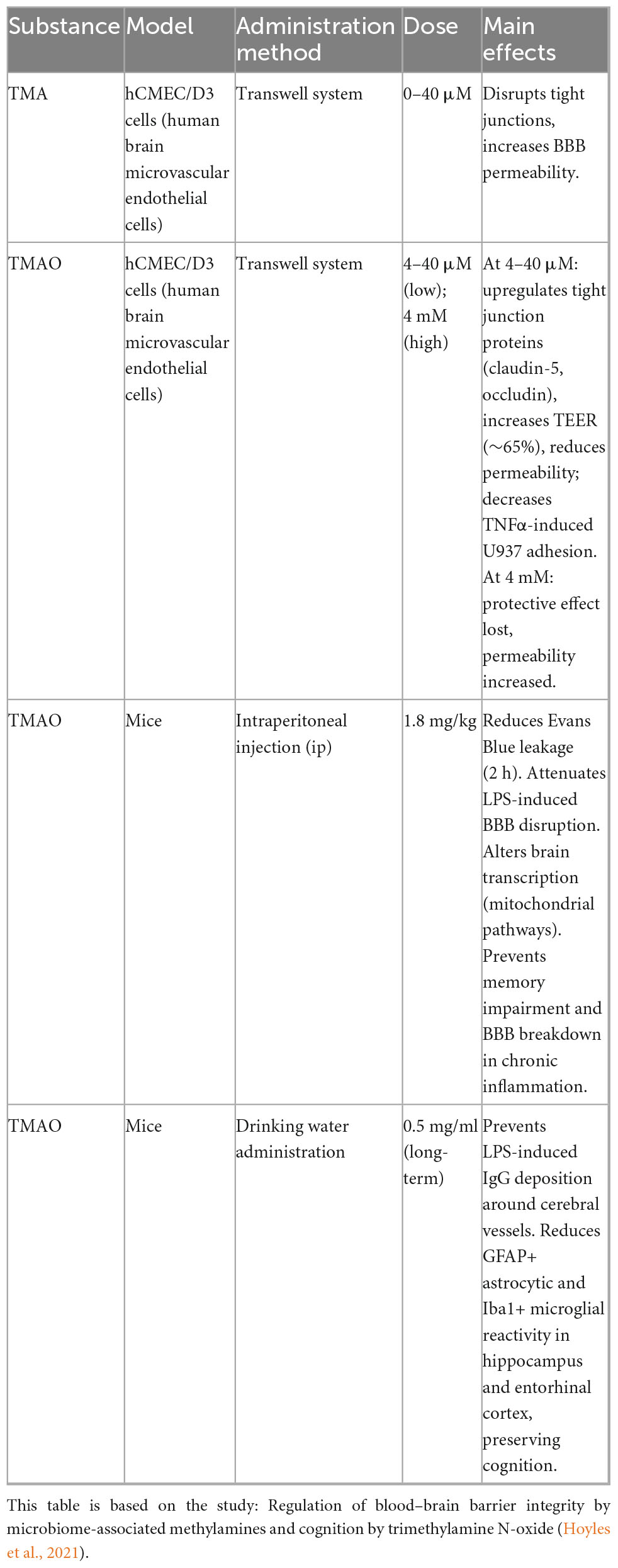 Mechanistic studies in cell and animal models provide deeper insights into how TMAO and its precursor trimethylamine (TMA) influence BBB integrity and AD-relevant pathways. In hCMEC/D3 endothelial monolayers, low-micromolar TMAO (≈4–40 μM) upregulates tight-junction proteins (e.g., claudin-1), reduces tracer permeability, and increases TEER (∼65%), thereby enhancing BBB integrity (Hoyles et al., 2021). Long-term TMAO treatment has also been shown to reduce astrocyte and microglial reactivity in specific brain regions, preserving cognitive function under inflammatory stress (Hoyles et al., 2021). In contrast, TMA, the precursor of TMAO, consistently impairs BBB function by disrupting tight-junction integrity and increasing permeability (Hoyles et al., 2021). However, chronic elevation of TMAO in AD mouse models promotes tau conformational changes and aggregation (Tseng and Graves, 1998), increases hippocampal β-secretase activity and amyloid-β deposition (Gao et al., 2019), activates the PERK–EIF2α–ER stress pathway (Govindarajulu et al., 2020), impairs hippocampal synaptic plasticity via the mTOR/P70S6K/4EBP1 axis (Li et al., 2018; Zhou et al., 2023), and upregulates circulating clusterin, potentially driving neuroinflammation and β-secretase–dependent Aβ pathology (Yu et al., 2013). In vascular dementia models, elevated TMAO further exacerbates cognitive deficits and neuropathological changes by inhibiting the SIRT1 pathway and inducing oxidative stress–mediated apoptosis (Deng et al., 2022).