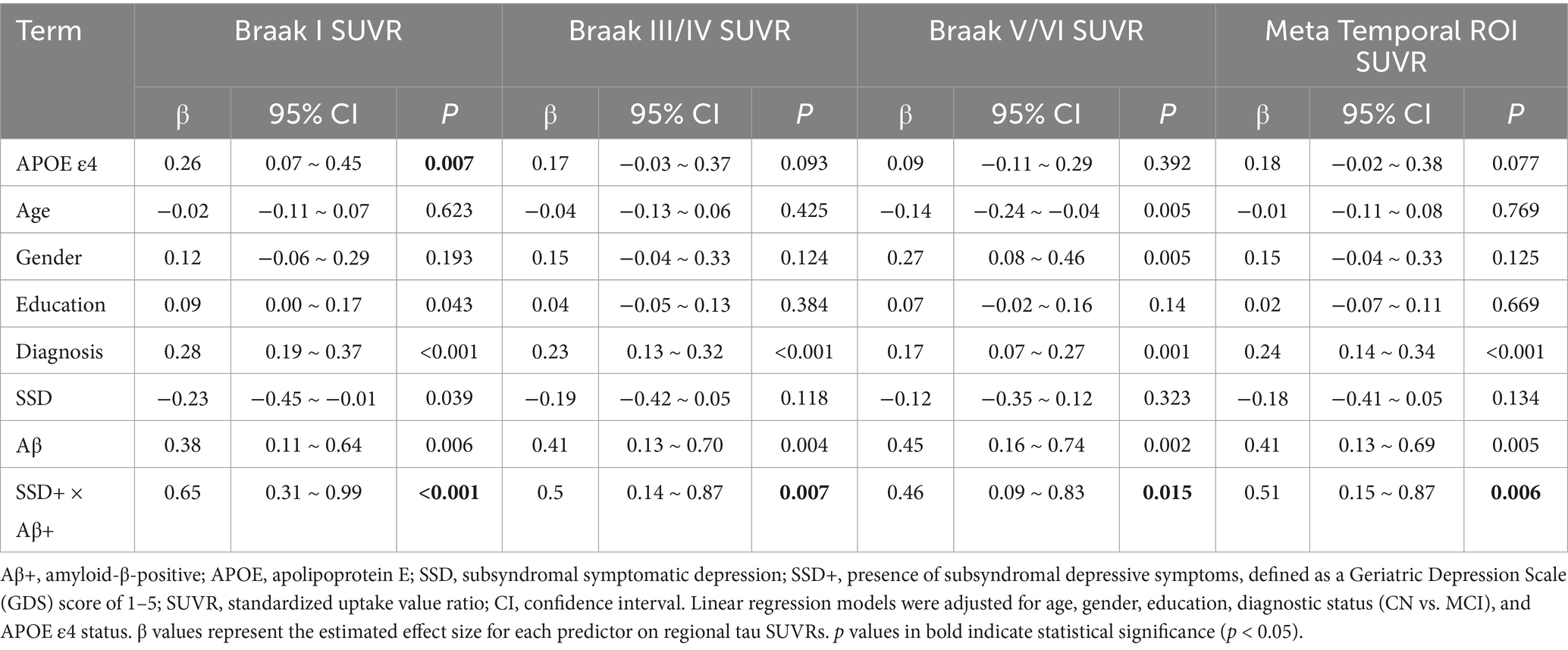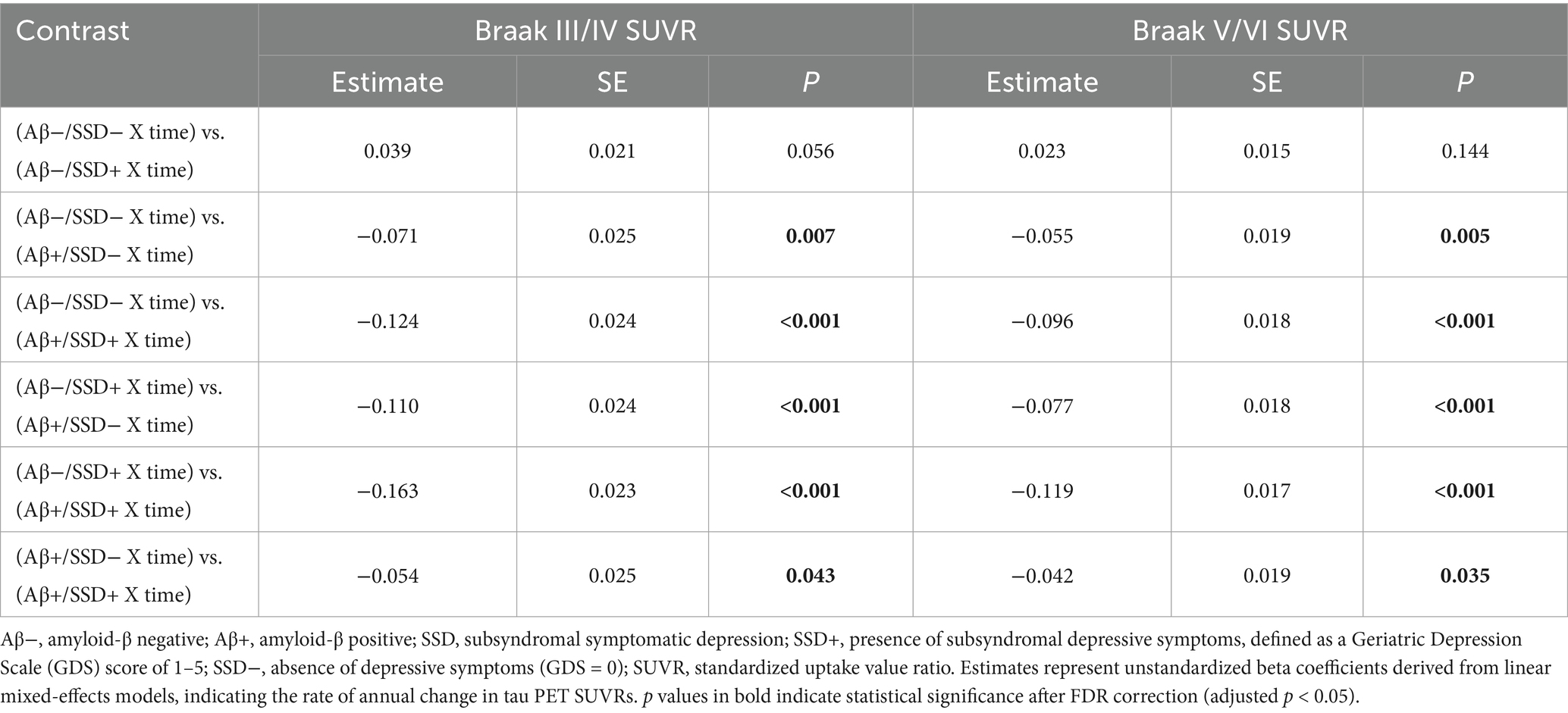 Materials and methods: We analyzed data from 391 non-demented older adults in the Alzheimer’s Disease Neuroimaging Initiative (ADNI) who underwent Aβ and tau positron emission tomography (PET) scans, as well as Geriatric Depression Scale (GDS-15) assessments. Aβ positivity (Aβ+) was defined by established tracer-specific standardized uptake value ratio (SUVR) thresholds (≥1.11 for 18F-florbetapir or ≥1.08 for 18F-florbetaben). SSD was defined as a GDS-15 score of 1–5. Linear mixed-effects models were applied to assess the longitudinal effects of SSD and Aβ status on regional tau accumulation over 2 years.