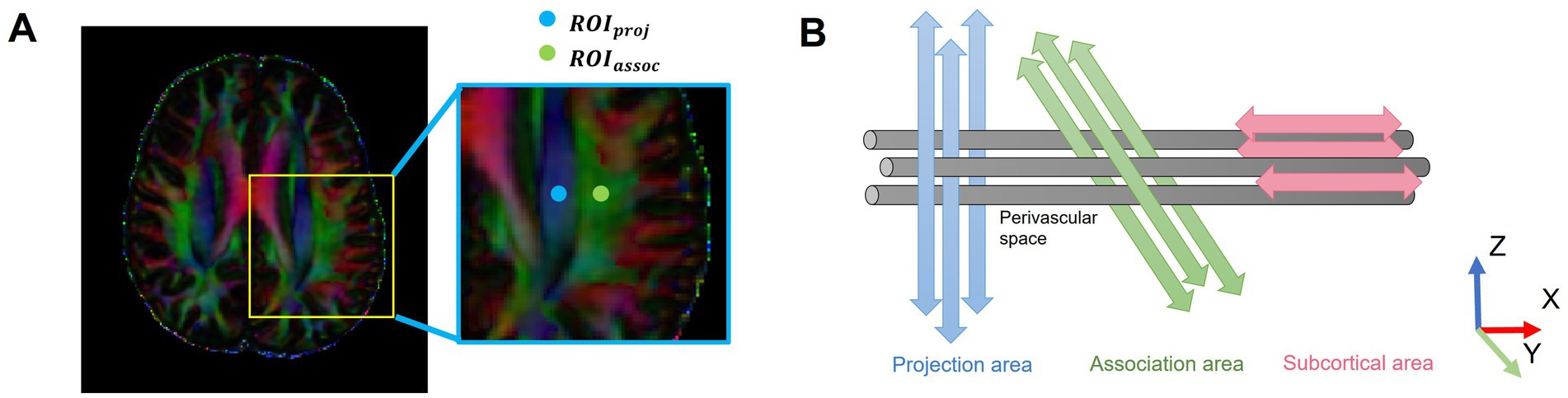 Figure 1. Schematic of the DTI-ALPS methodology. (A) Two ROIs were placed on the projection fibers (blue; z-axis) and association fibers (green; y-axis) in the left hemisphere, where the deep medullary veins were vertical to the ventricular body, on a color-coded FA map. (B) The schematic diagram shows the relationship between the direction of the PVS (gray cylinders) and subcortical fibers (red; x-axis), association fibers (green; y-axis), and projection fibers (blue; z-axis). The direction of the PVS is perpendicular to projection and association fibers. DTI-ALPS, diffusion tensor imaging analysis along the perivascular space; ROIs, regions of interest; PVS, perivascular spaces; proj, projection fibers; assoc., association fibers.