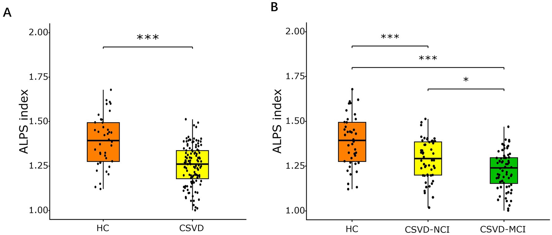 Box plots comparing ALPS index across different groups. Panel A shows a higher ALPS index in HC (orange) compared to CSVD (yellow), with significant difference marked by three stars. Panel B includes HC, CSVD-NCI (yellow), and CSVD-MCI (green), showing significant differences among all groups.
