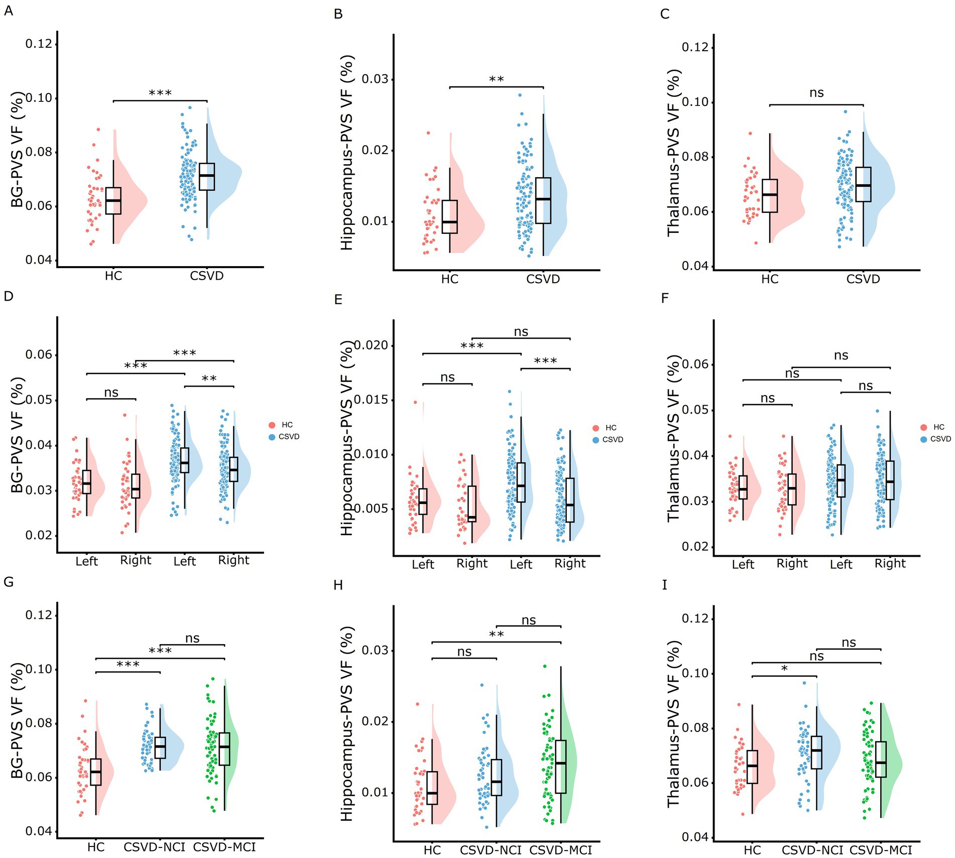 Figure 3. Rain-cloud plots of comparison of the subcortical nucleus PVS VF among different diagnostic groups. (A–C) Comparisons of the total PVS VF in BG, hippocampus, and thalamus between HC and CSVD groups. (D–F) Comparisons of the PVS VF in left and right hemispheres between HC and CSVD groups in BG, hippocampus, and thalamus. (G–I) Comparisons of the total PVS VF in BG, hippocampus, and thalamus among HC, CSVD-NCI, and CSVD-MCI groups. Group differences for normally distributed PVS VF data were assessed using one-way ANOVA with post-hoc Bonferroni correction. PVS VF, perivascular space volume fraction; HC, healthy control; CSVD, cerebral small vessel disease; NCI, no cognitive impairment; MCI, mild cognitive impairment; BG, basal ganglia. *p < 0.05, **p < 0.01, ***p < 0.001 after Bonferroni correction.