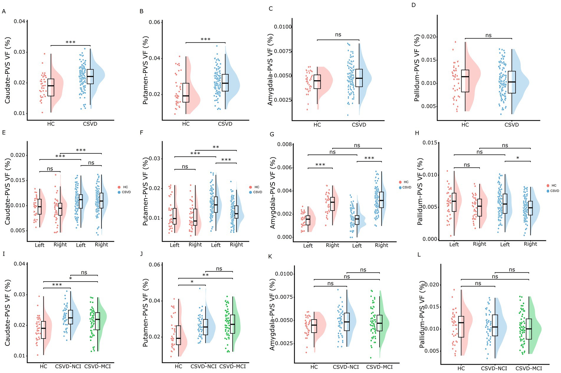 Figure 4. Rain-cloud plots of comparison of the PVS VF among BG subdivisions across diagnostic groups. (A–D) Comparisons of the total PVS VF in caudate, putamen, amygdala, and pallidum between HC and CSVD groups. (E–H) Comparisons of the PVS VF in left and right hemispheres between HC and CSVD groups in caudate, putamen, amygdala, and pallidum. (I–L) Comparisons of the total PVS VF in caudate, putamen, amygdala, and pallidum among HC, CSVD-NCI, and CSVD-MCI groups. Group differences for normally distributed PVS VF data were assessed using one-way ANOVA with post-hoc Bonferroni correction. PVS VF, perivascular space volume fraction; HC, healthy control; CSVD, cerebral small vessel disease; NCI, no cognitive impairment; MCI, mild cognitive impairment; BG, basal ganglia. *p < 0.05, **p < 0.01, ***p < 0.001 after Bonferroni correction.