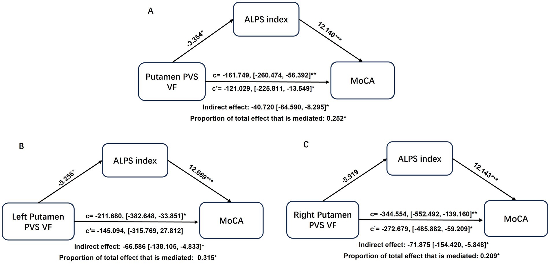 Figure 6. Mediation analysis of ALPS index in the associations of putamen-PVS VF (A), left putamen-PVS VF (B), right putamen-PVS VF (C) with MoCA. Demographics and VRFs were regarded as covariates. Path coefficients with p values (*p < 0.05, **p < 0.01, ***p < 0.001, respectively). ALPS, analysis along the perivascular space; CSVD, cerebral small vessel disease; PVS, perivascular spaces; VF, volume fraction; VRFs, vascular risk factors.