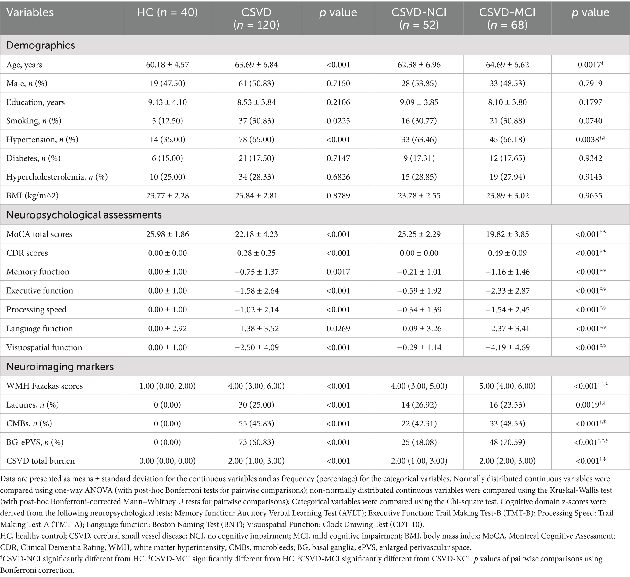 Table 1. Baseline demographic, cognitive function, and neuroimaging characteristics among HC, CSVD-NCI, and CSVD-MCI groups.