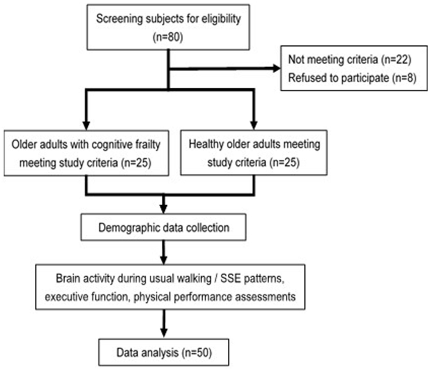 This was a cross-sectional study, study flowchart shown as Figure 1. Study protocol was approved by the Institutional Review Board of National Yang Ming Chiao Tung University (YM110152F, NYCU112078AE) and preregistered on the ClinicalTrials.gov website1 (NCT05891574, NCT05173363). All participants were provided with and signed the written informed consent form of the study. Age, gender, education level, frailty status, and global cognition status (MMSE and MoCA scores) were collected as demographic characteristics. As for assessment, brain activity during SSEs and usual walking, SSEs performance, walking speed, executive function, and physical performance were measured.