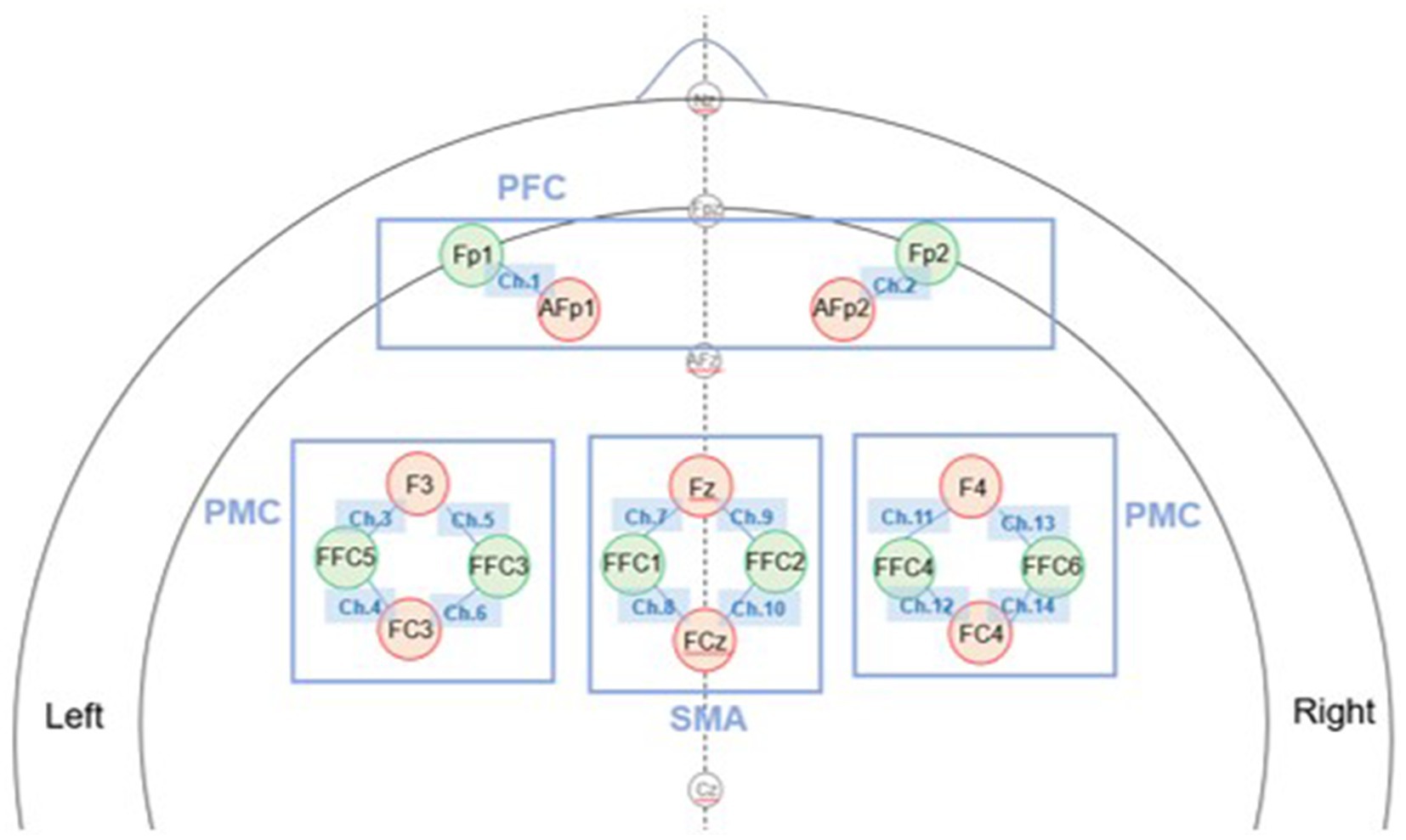 Figure 2. Configuration of fNIRS optodes and measurement channels. Optode placement was determined according to the international 10–5 system (top view). The setup consisted of 16 optodes (8 sources in red and 8 detectors in green) forming 14 measurement channels covering the bilateral prefrontal cortex (PFC), premotor cortex (PMC), and supplementary motor area (SMA). Each line connecting a source and a detector represents one measurement channel.