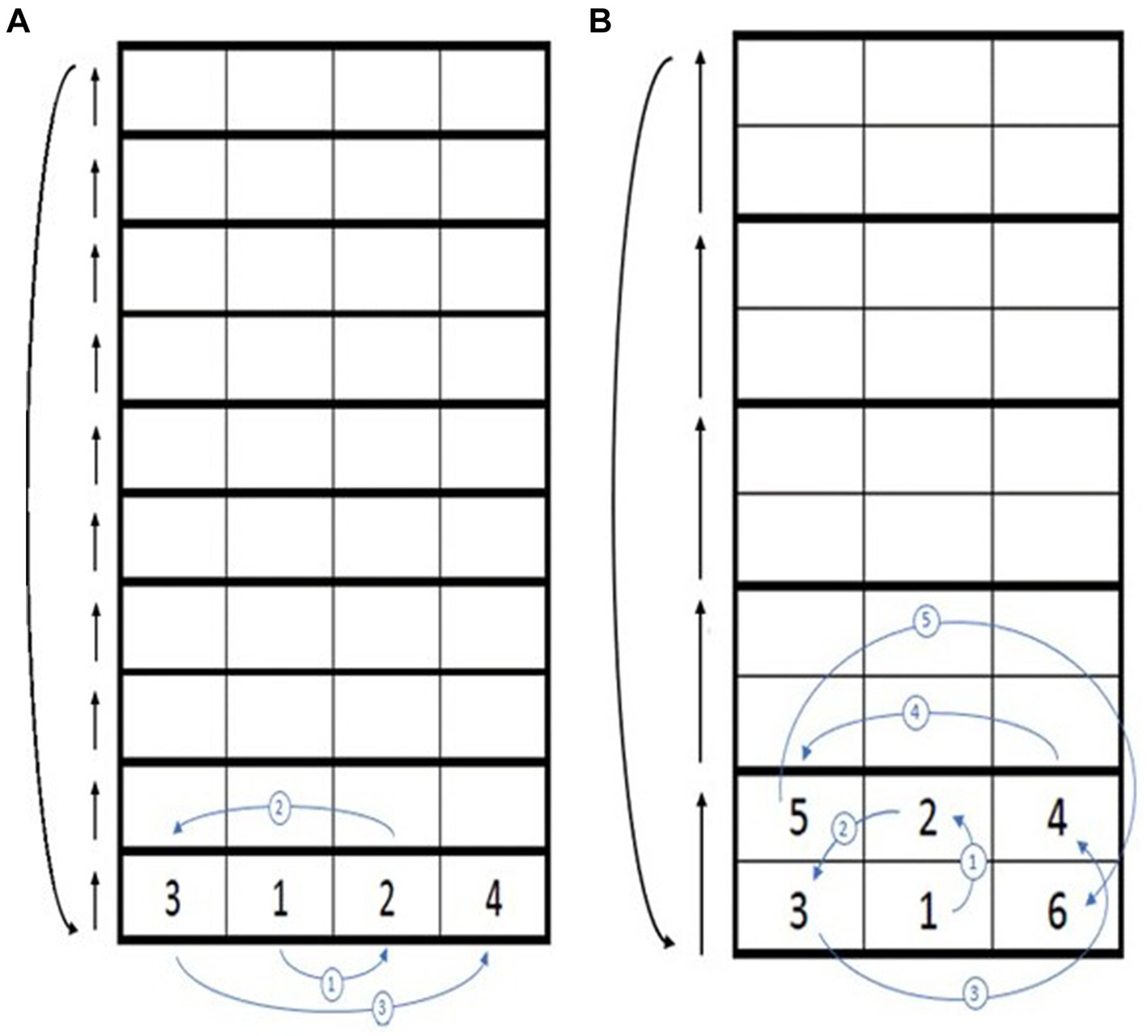 Figure 3. Square-stepping exercise (SSE) patterns with different difficulty levels. (A) SSE pattern 1; (B) SSE pattern 2. The numbers in the squares (1, 2, 3, …) indicate the stepping sequence, beginning with the left foot and alternating between feet according to the numbered order. In SSE1, a four-step cycle is repeated, whereas SSE2 consists of a six-step cycle involving forward, oblique, and backward movements, representing a higher level of motor and cognitive complexity. After completing one full sequence, participants advance forward by four squares in SSE1 or six squares in SSE2 to begin the next cycle, maintaining a continuous stepping flow throughout the task.