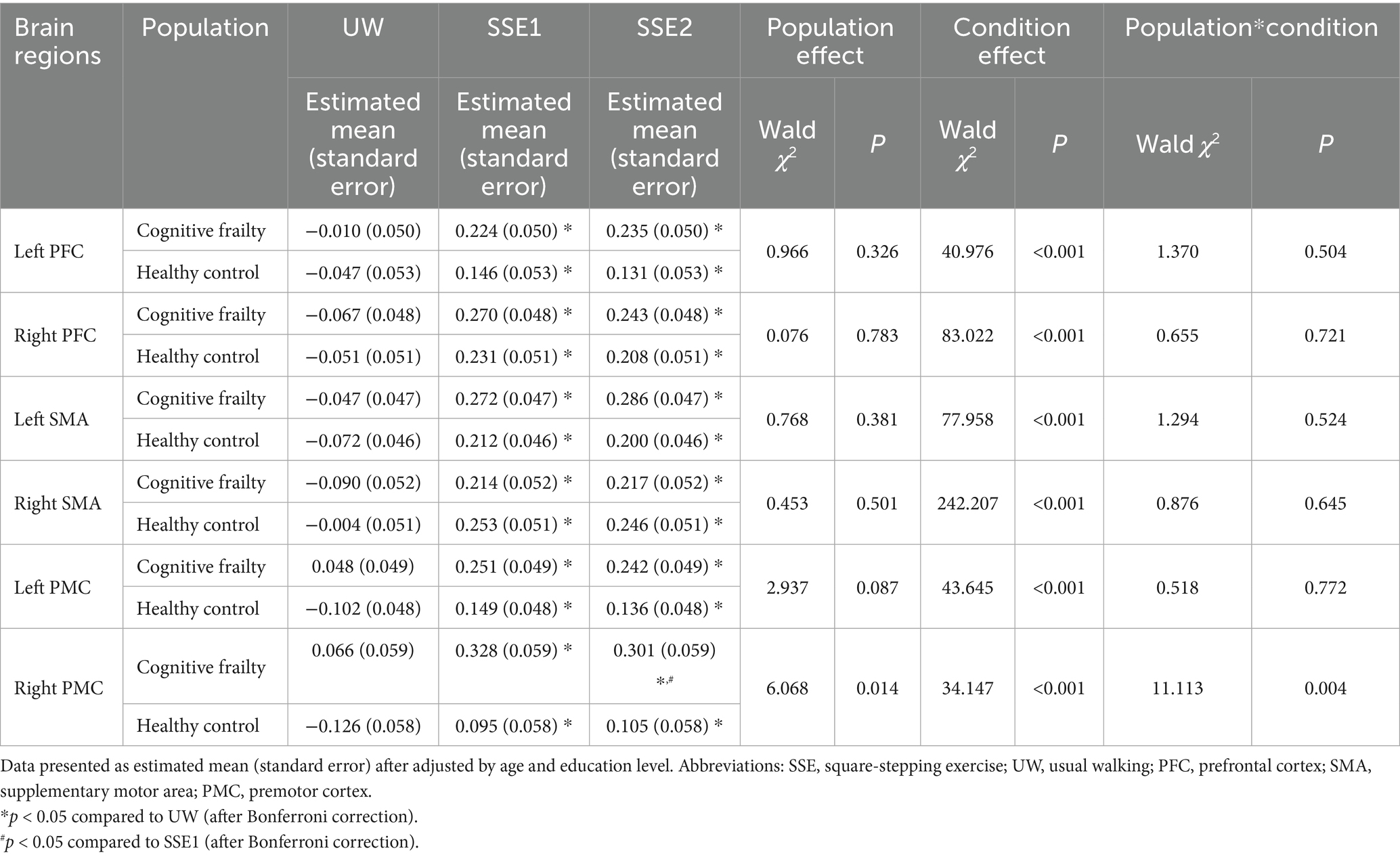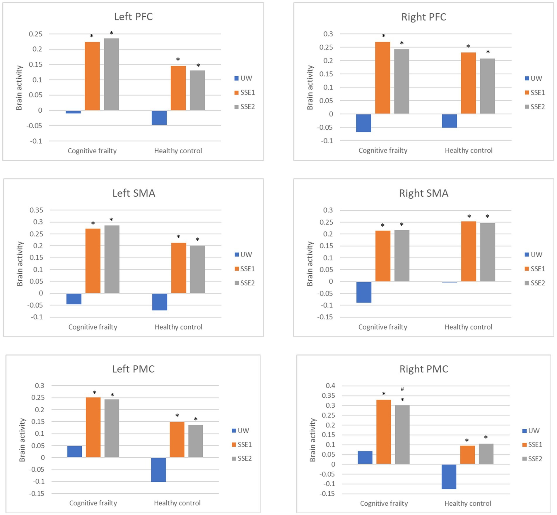 Figure 4. Brain activation between populations (cognitive frailty vs. healthy controls) and conditions (UW, SSE1, SSE2). Bars represent brain activities adjusted for age and education level. SSE, square-stepping exercise; UW, usual walking; PFC, prefrontal cortex; SMA, supplementary motor area; PMC, premotor cortex. *p < 0.05 compared to UW (after Bonferroni correction). #p < 0.05 compared to SSE1 (after Bonferroni correction).