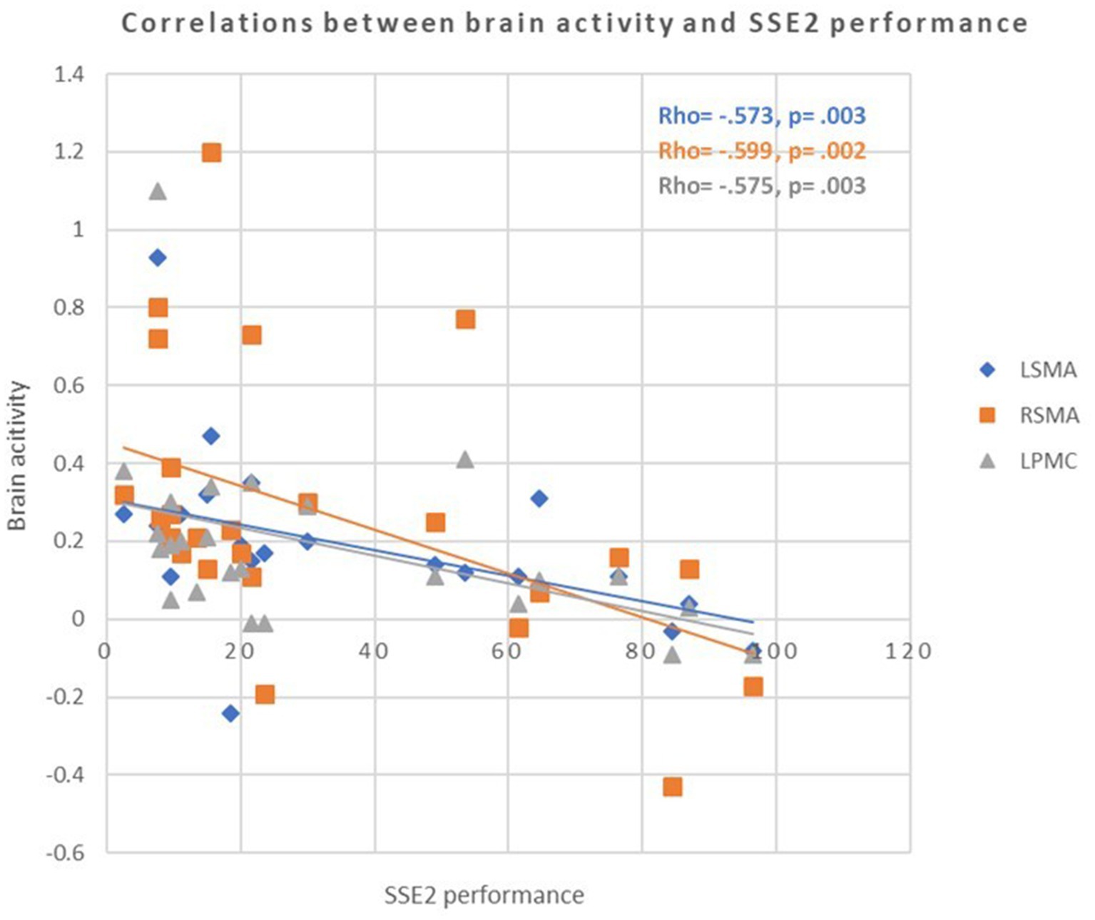 Figure 5. Scatter plots showing the correlations between brain activity and square-stepping exercise (SSE2) performance in older adults with cognitive frailty. Greater activation in the left and right supplementary motor areas (LSMA, RSMA) and left premotor cortex (LPMC) was associated with poorer performance, indicating neural inefficiency. Solid lines represent linear regression fits (p < 0.0042, Bonferroni-corrected).