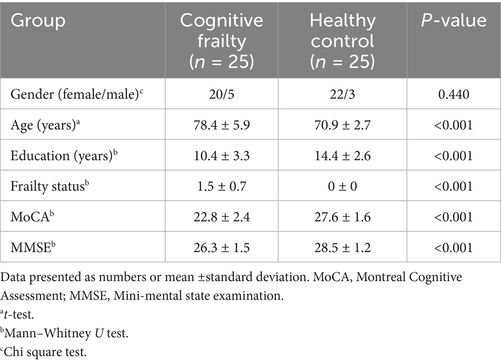 Figure 1 illustrates the flow chart of the present study. Twenty-five cognitive frailty participants and 25 healthy control were recruited. Demographic characteristics of both populations are listed in Table 1. There were 20 females and 5 males in cognitive frailty group and 22 females and 3 males in the healthy control group. A mean of 1.5 frailty characteristics was shown in cognitive frailty group while 3 among the 25 participants were identified as frail (Fried score = 3, n = 3), and the other 22 participants were identified as prefrail (Fried score = 1, n = 15; Fried score = 2, n = 7). The mostly matched frailty criterion was weakness (n = 9). Low physical activity level and exhaustion were each presented in 8 participants, while slowness and weight loss criteria were, respectively, noted in 7 and 6 participants, respectively. The frailty status and cognitive function of the two groups revealed significant difference, corresponding to their population features. An average score of 22.8 on MoCA and 26.3 on MMSE were noted in cognitive frailty group, and 27.6 on MoCA and 28.5 on MMSE in healthy control group. The group differences were also presented in age and education level (p < 0.001; p < 0.001). The cognitive frailty group (mean age: 78.4 years; mean education level: 10.4 years) had a higher mean age and a lower mean education level compared to the healthy control group (mean age: 70.9 years; mean education level: 14.4 years). Therefore, age and education level were used as covariates in the comparison analysis between the populations.