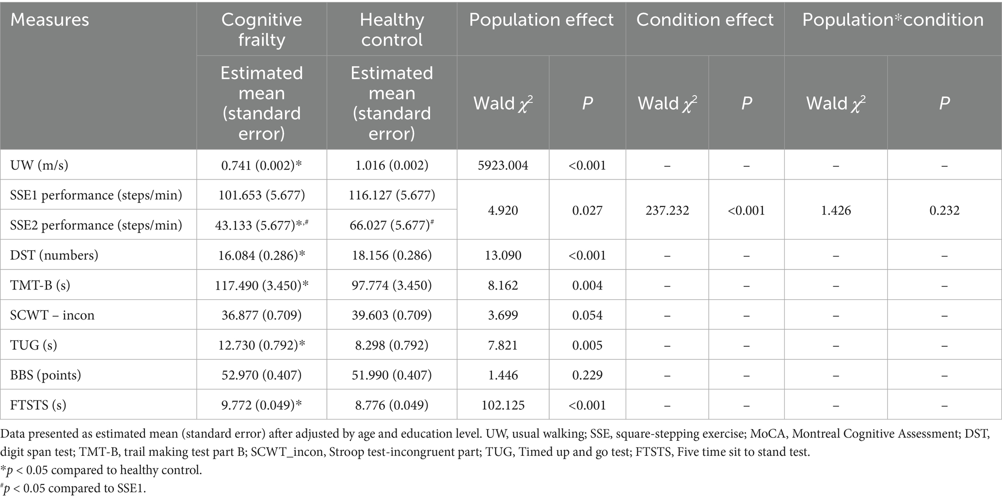 Cognitive-motor task performance was compared between populations (cognitive frailty/healthy) and conditions (SSE1/SSE2). As shown in Table 3, after adjustments of age and education level, the GEE model revealed significant population effect (p < 0.05) and condition effect (p < 0.001), but not population by condition interaction. In the multiple comparisons, both population groups completed fewer correct steps during SSE2 than SSE1. Older adults with cognitive frailty completed comparable steps as healthy older adults during SSE1 (p > 0.05), but completed less correct steps than healthy older adults during SSE2 (p < 0.001).