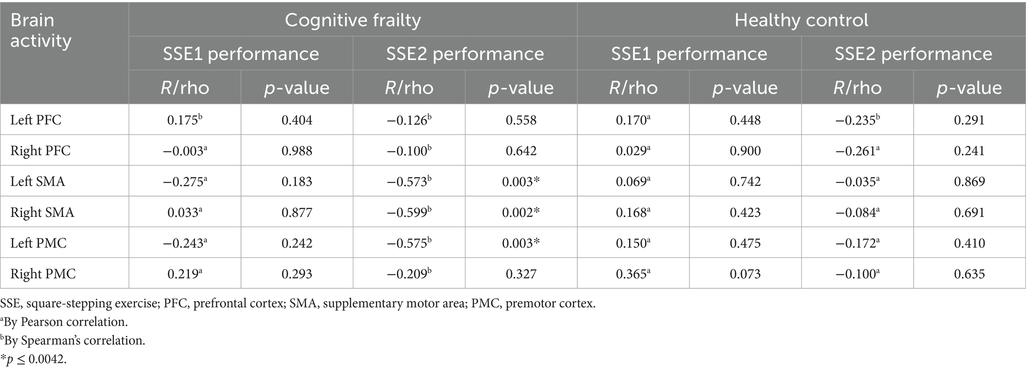 The relationships between SSEs performance and brain activity are reported in Table 4 and Figure 5. Significant correlations were only found in cognitive frailty group. When performing SSE 2, the activity of left and right SMA (rho = −0.573, p = 0.003; rho = −0.599, p = 0.002), as well as left PMC (rho = −0.575, p = 0.003) in older adults with cognitive frailty was negatively correlated to the performance of SSE 2.
