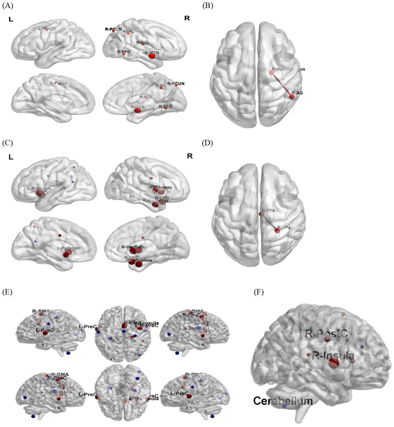 Figure 2. Brain regions exhibiting significant functional connectivity. (A) DAN as the seed point. (B) hippocampus as seed point. (C) The left VTA as seed point. (D) The right VTA as seed point. (E) The right locus coeruleus as the seed point. (F) The left locus coeruleus as the seed spot. The size of the ball represents the size of the Cluster, which indicates the magnitude of significance (Red: Enhanced functional connectivity, Blue: Weakened functional connectivity). PCUN, precuneus; IPL, inferior parietal lobule; ROL, Roland-Dick island gim; FFG, fusiform gyrus; Pre-CG, precentral gyrus; MFG, middle frontal gyrus; AG, angular gyrus; OFC, orbitofrontal gyrus amygdala; NA, nucleus accumbens; AI, anterior insula; TPJ, temporoparietal symphysi; SMA, Supplementary Motor Area; insula, insular cortex; PreC, Precentral gyrus; ACC, Anterior cingulate cortex; PostC, Postcentral gyrus cerebellum.
