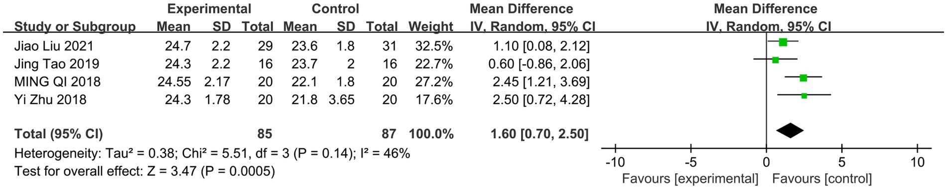 This study conducted a meta-analysis of the effects of interventions for global cognitive function. As shown in Figure 2, a meta-analysis of 4 studies using the MoCA scale demonstrated a significant effect of aerobic exercise intervention on global cognitive function improvement (MD = 1.6; 95% CI: 0.70 to 2.50; p = 0.0005). Heterogeneity tests indicated moderate heterogeneity among the studies (I2 = 46%, τ2 = 0.38), which directly impacts the reliability of the pooled results. Given the limited number of included studies, it is difficult to trace the specific sources of heterogeneity, and thus subgroup analysis or other methods cannot be applied to identify its origins. Consequently, although the pooled effect size is statistically significant, the moderate heterogeneity suggests that the findings of this study should be interpreted as providing preliminary support for the benefits of mind–body exercises rather than conclusive evidence. These findings serve as an important summary of the current evidence and lay the groundwork for more in-depth future research (Zhu et al., 2018; Qi et al., 2019; Tao et al., 2019; Liu et al., 2021).