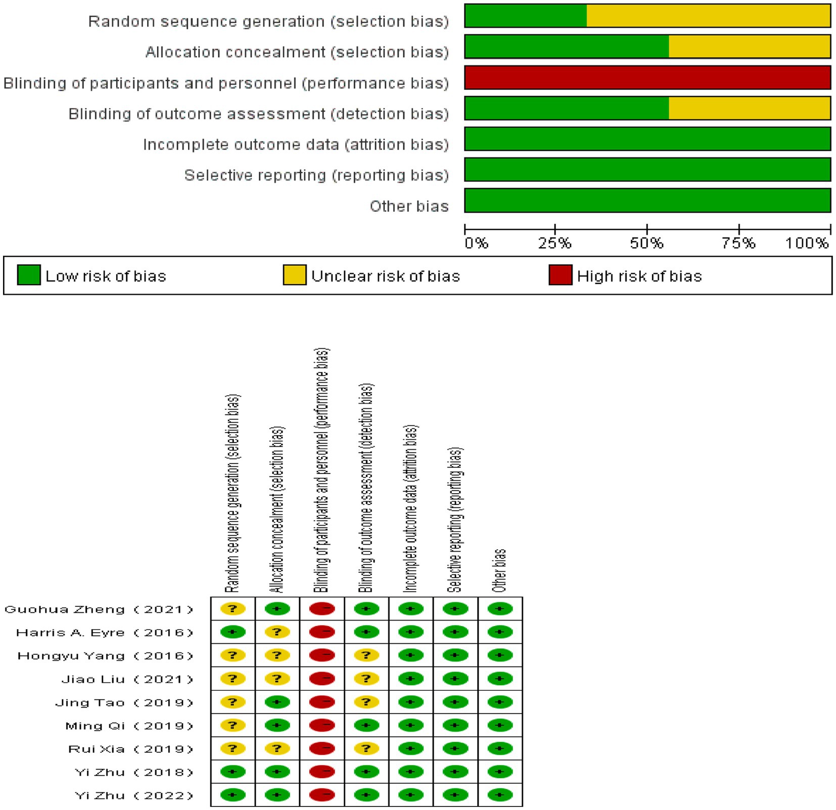 The biases identified in the reviewed studies are illustrated in Figure 5. Several studies employed standard methods, such as computer-generated randomized sequences, for implementing allocation concealment strategies, resulting in the categorization of allocation concealment as a “low risk” level (Zhu et al., 2018, 2022; Qi et al., 2019; Tao et al., 2019; Zheng et al., 2021). However, other studies did not specify their allocation concealment methods, leading to an “unclear” status (Eyre et al., 2016; Yang et al., 2016; Xia et al., 2019; Liu et al., 2021). Due to the inherent characteristics of the intervention, the implementation of blinding, both for researchers and participants, was not feasible across all studies reviewed. In five studies, all result assessors were blinded (Eyre et al., 2016; Zhu et al., 2018, 2022; Qi et al., 2019; Zheng et al., 2021), whereas blinding status of assessors was unspecified in the remaining four studies (Yang et al., 2016; Tao et al., 2019; Xia et al., 2019; Liu et al., 2021). All studies were assessed as having a low risk of attrition bias and reporting bias.