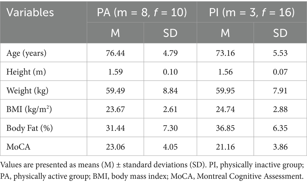Physical activity levels were quantified using the IPAQ, a validated self-report tool widely used in geriatric research for its reliability and sensitivity to habitual exercise behavior (Tomioka et al., 2011). Based on weekly activity, participants who met the guidelines (≥150-min moderate or ≥75-min vigorous activity) were classified as part of the physically active (PA) group, whereas those below the threshold were categorized as part of the physically inactive (PI) group. To confirm that the two groups were clearly distinct in their physical activity levels, we compared weekly minutes of moderate-to-vigorous physical activity (MVPA) between the groups. The PA group reported significantly greater MVPA (M = 252.22 min, SD = 127.63) than the PI group (M = 24.74 min, SD = 43.12), t (35) = − 7.667, p < 0.001.