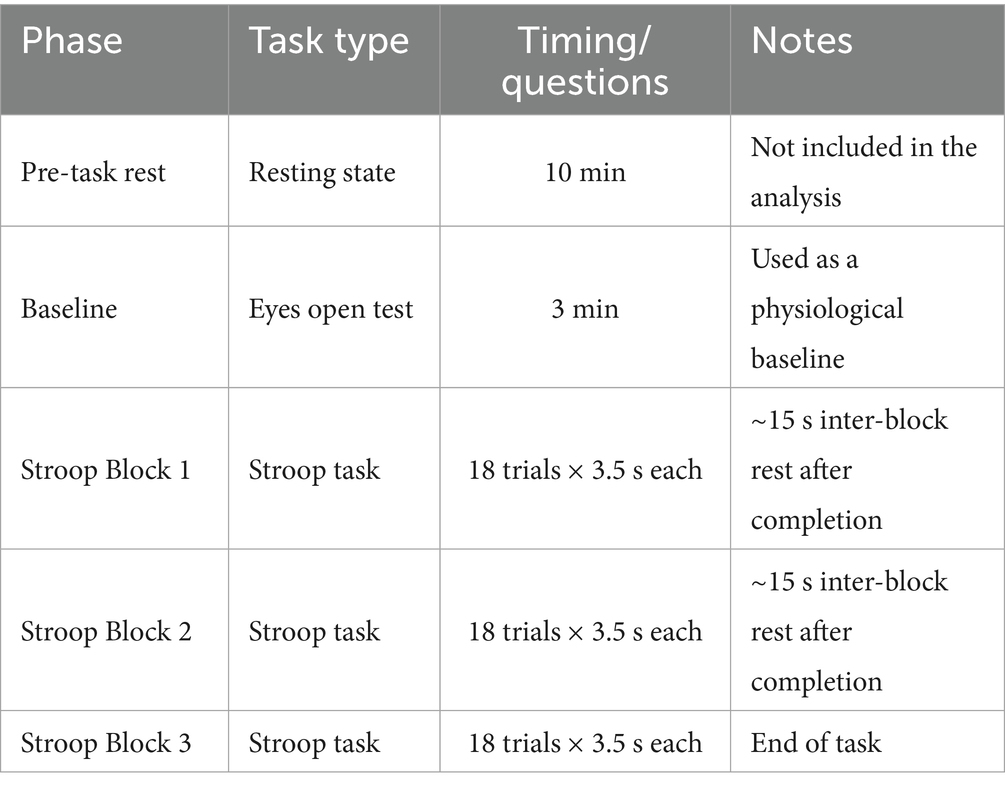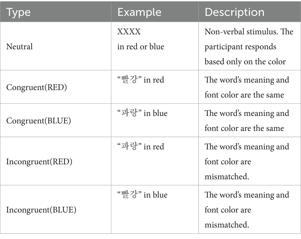 Participants viewed Korean stimuli (“빨강” [red], “파랑” [blue], or neutral “XXXX”) on a computer screen and were instructed to respond based on the color of the text, not the meaning of the word. A left-button response was required for red, and a right-button response was required for blue. This incongruent condition created a demand for cognitive inhibition (Table 3). The task included three blocks of 18 trials (54 trials in total), with each stimulus being displayed for 3.5 s. All the responses were recorded using the Python-based software (Python Software Foundation, Wilmington, DE, United States). The task structure was as follows: number of blocks = 3, number of trials per block = 18, and stimulus duration = 3.5 s. The participants completed a practice block before the actual task, and both reaction time and accuracy were used for the analysis.