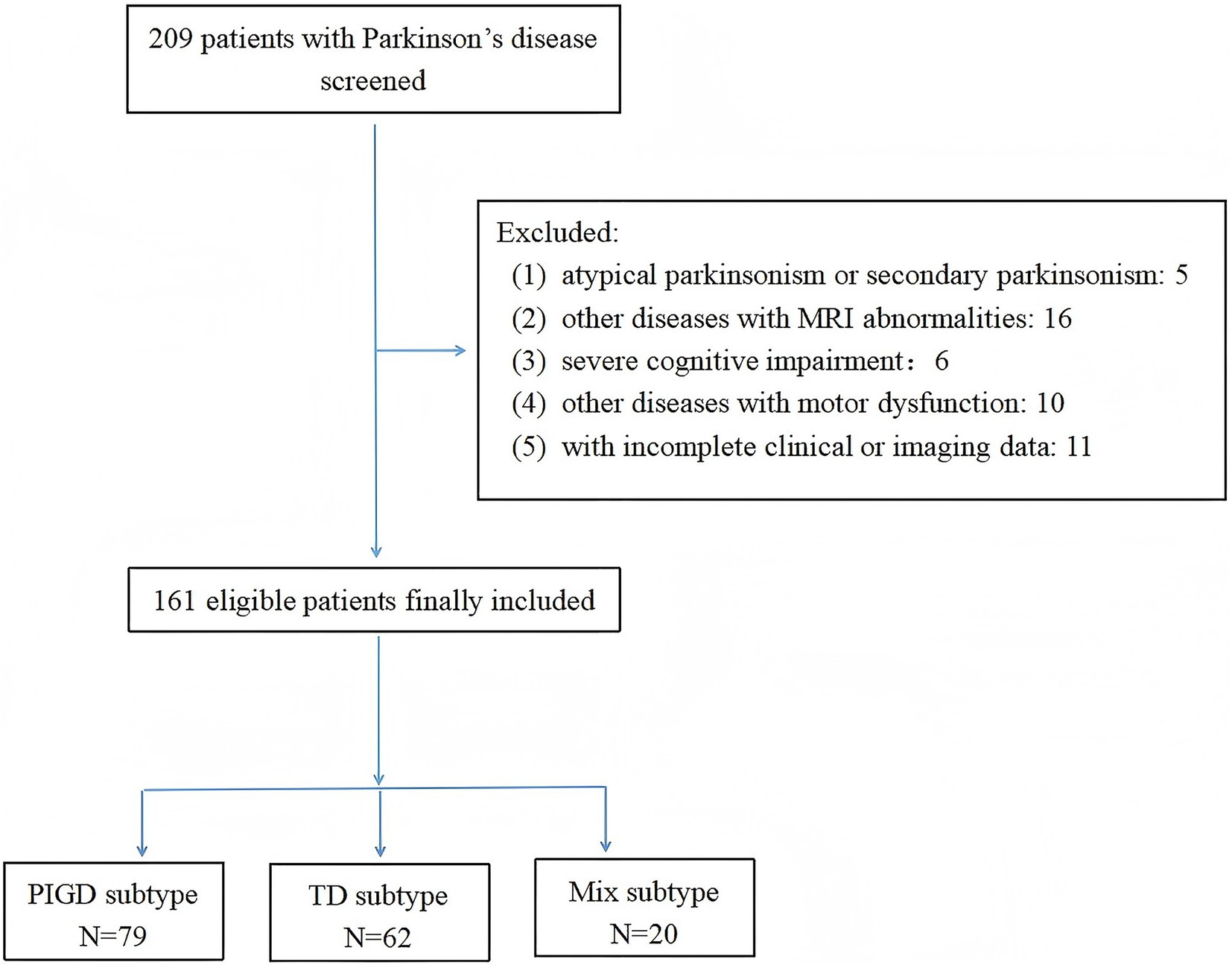 The inclusion criteria included (1) diagnosis of idiopathic PD according to the International Parkinson and Movement Disorder Society (MDS) Clinical Diagnostic Criteria in 2015, (2) age ≥ 50 years, (3) ability to undergo brain magnetic resonance imaging (MRI) without contraindications, and (4) ability to provide informed consent and complete the clinical assessments. The exclusion criteria were as follows: (1) atypical parkinsonism or secondary parkinsonism (e.g., vascular parkinsonism, drug-induced), (2) major psychiatric disorders or severe cognitive impairment precluding reliable assessment, (3) other diseases with MRI abnormalities, such as cerebral ischemic stroke, cerebral hemorrhage, brain tumors, brain trauma, multiple sclerosis, central nervous system infection, hydrocephalus, or autoimmune encephalitis, (4) with other diseases that can cause motor dysfunction (e.g., cerebrovascular disease, neuromuscular junction disease, limb fracture), and (5) with incomplete clinical or imaging data.