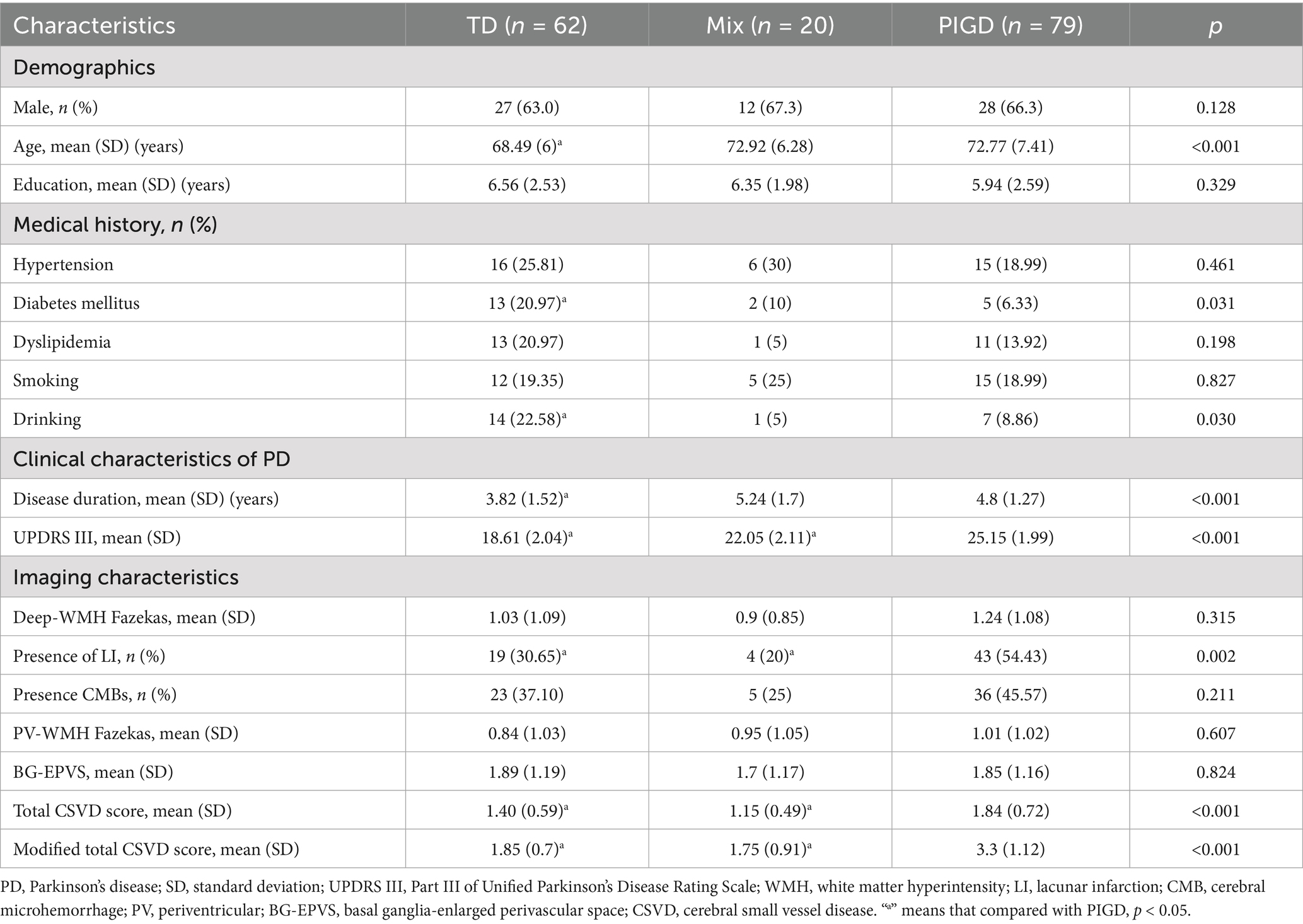 Methods: This cross-sectional study enrolled 161 PD patients (mean age 71.14 ± 7.04 years). Motor subtyping [postural instability and gait difficulty (PIGD)/tremor-dominant (TD)/intermediate type (IT)] used MDS-UPDRS-derived ratios. CSVD burden was quantified via two validated MRI-based scores: the total CSVD burden score (range 0–4) and modified CSVD burden score (range 0–6). Multivariate logistic regression analysis, which adjusted for age, gender, disease duration, and vascular risk factors, was used to explore the correlation between CSVD burden and PIGD.