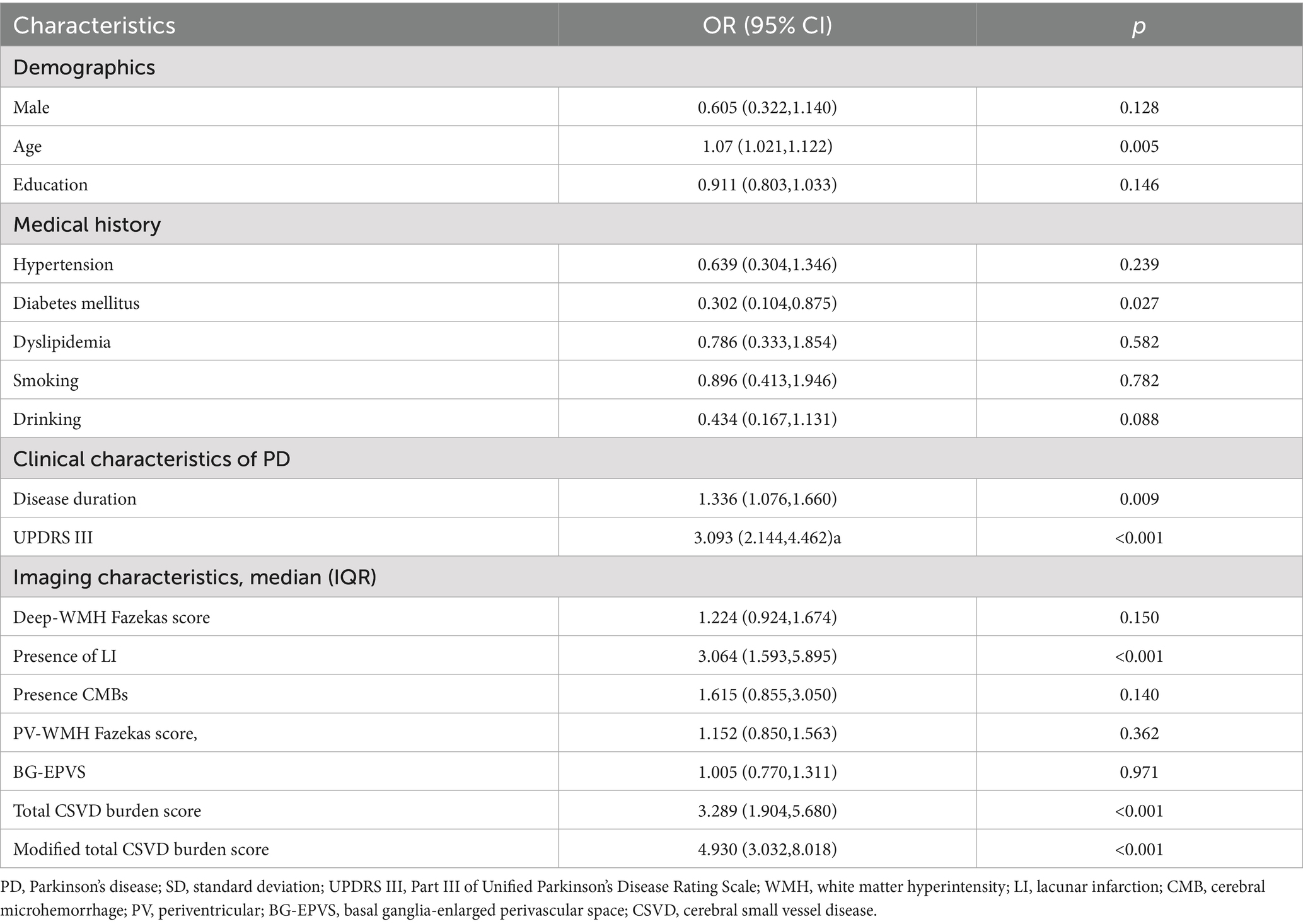Conclusion: Global CSVD burden was independently associated with the occurrence of PIGD in PD. CSVD assessment may help identify PD patients at the highest risk for axial motor disability, highlighting the convergence of vascular and neurodegenerative pathologies.
