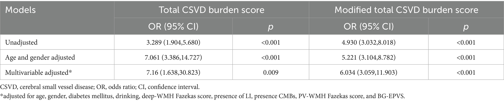 The severity of CSVD was assessed using two scoring systems: the total CSVD burden score proposed by Staals et al. and the modified total CSVD burden score developed by Lau et al. (2017) (Staals et al., 2014; Lau et al., 2017; Wardlaw et al., 2013). Both scoring systems incorporate the four MRI markers of CSVD mentioned above. The original total CSVD burden score ranges from 0 to 4, with one point assigned for the presence of each of the following: lacunae, CMBs (each counted separately), moderate-to-severe white matter hyperintensities (WMH), defined as periventricular WMH with a Fazekas score of 3 or deep WMH with a Fazekas score ≥2, and moderate-to-severe basal ganglia EPVS (BG-EPVS) with a count of ≥11 (Supplementary Table 4). In contrast, the modified total CSVD burden score ranges from 0 to 6. One point is assigned for the presence of lacunae, CMBs with a count of 1–4, severe BG-EPVS (>20), and moderate WMH burden (total WMH grade 3–4), whereas two points are allocated for high CMB burden (≥5) and severe WMH burden (total WMH grade 5–6) (Liu et al., 2024) (Supplementary Table 5).